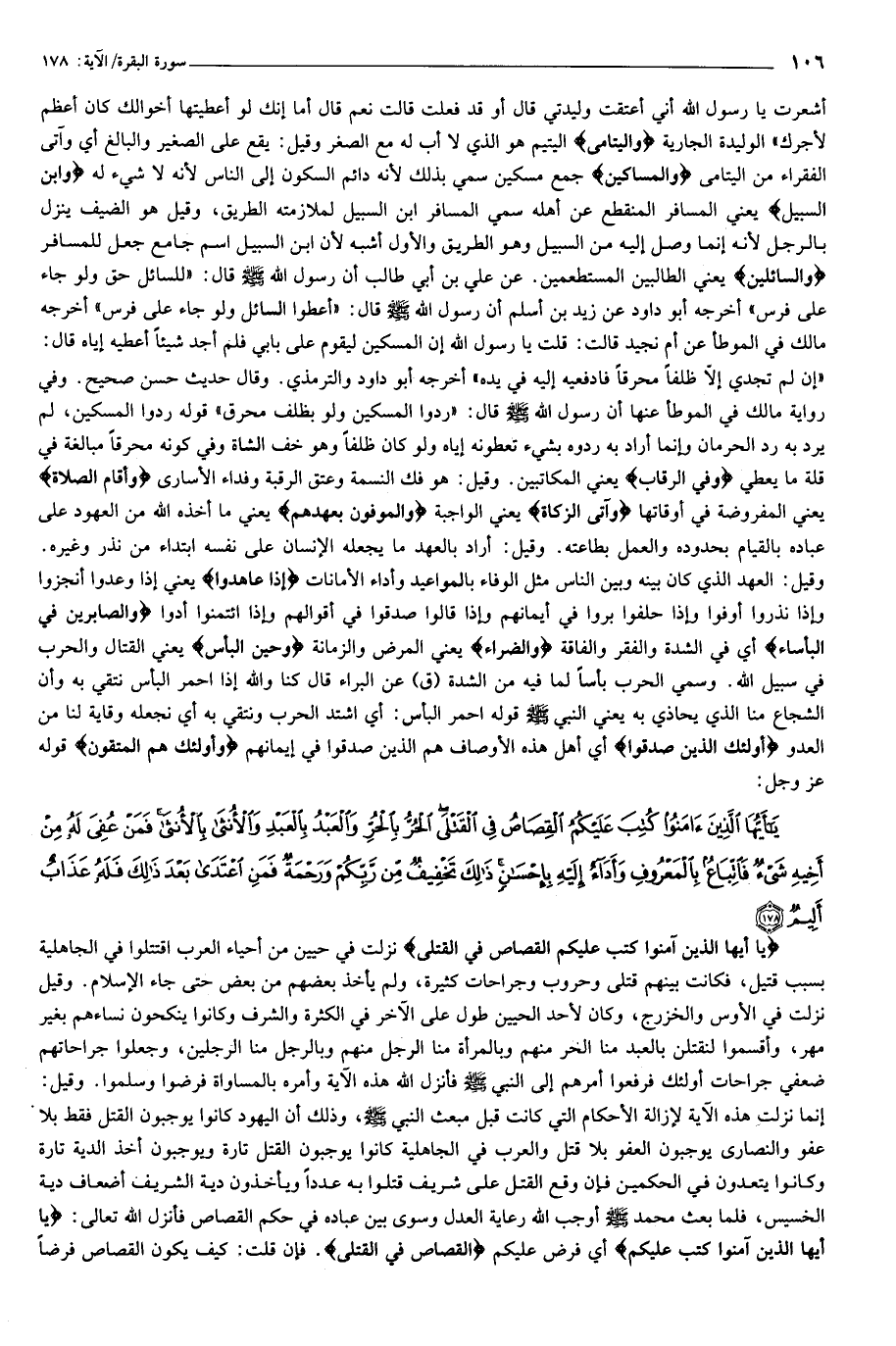 يا أَيُّهَا الَّذِينَ آمَنُوا كُتِبَ عَلَيْكُمُ الْقِصاصُ فِي الْقَتْلى نزلت في حيين من أحياء العرب اقتتلوا في الجاهلية بسبب قتيل، فكانت بينهم قتلى وحروب وجراحات كثيرة، ولم يأخذ بعضهم من بعض حتى جاء الإسلام. وقيل نزلت في الأوس والخزرج، وكان لأحد الحيين طول على الآخر في الكثرة والشرف وكانوا ينكحون نساءهم بغير مهر، وأقسموا لنقتلن بالعبد منا الحر منهم وبالمرأة منا الرجل منهم وبالرجل منا الرجلين، وجعلوا جراحاتهم ضعفي جراحات أولئك فرفعوا أمرهم إلى النبي صلّى الله عليه وسلّم فأنزل الله هذه الآية وأمره بالمساواة فرضوا وسلموا. وقيل: