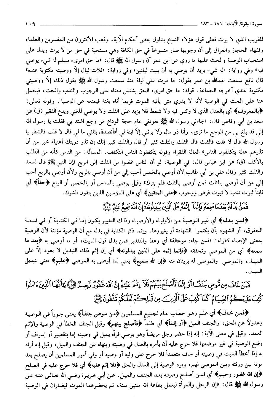 للقريب الذي لا يرث فعلى قول هؤلاء النسخ يتناول بعض أحكام الآية، وذهب الأكثرون من المفسرين والعلماء وفقهاء الحجاز والعراق إلى أن وجوبها صار منسوخا في حق الكافة وهي مستحبة في حق من لا يرث ويدل على استحباب الوصية والحث عليها ما روي عن ابن عمر أن رسول الله صلّى الله عليه وسلّم قال: «ما حق امرئ مسلم له شيء يوصي فيه» وفي رواية: «له شيء يريد أن يوصي به أن يبيت ليلتين» وفي رواية: «ثلاث ليال إلّا ووصيته مكتوبة عنده» قال نافع سمعت عبد الله بن عمر يقول: ما مرت علي ليلة منذ سمعت رسول الله صلّى الله عليه وسلّم يقول ذلك إلّا ووصيتي مكتوبة عندي أخرجه الجماعة. قوله: ما حق امرئ الحق يشتمل معناه على الوجوب والندب والحث، فيحمل هنا على الحث في الوصية لأنه لا يدري متى يأتيه الموت فربما أتاه بغتة فيمنعه عن الوصية. وقوله تعالى: