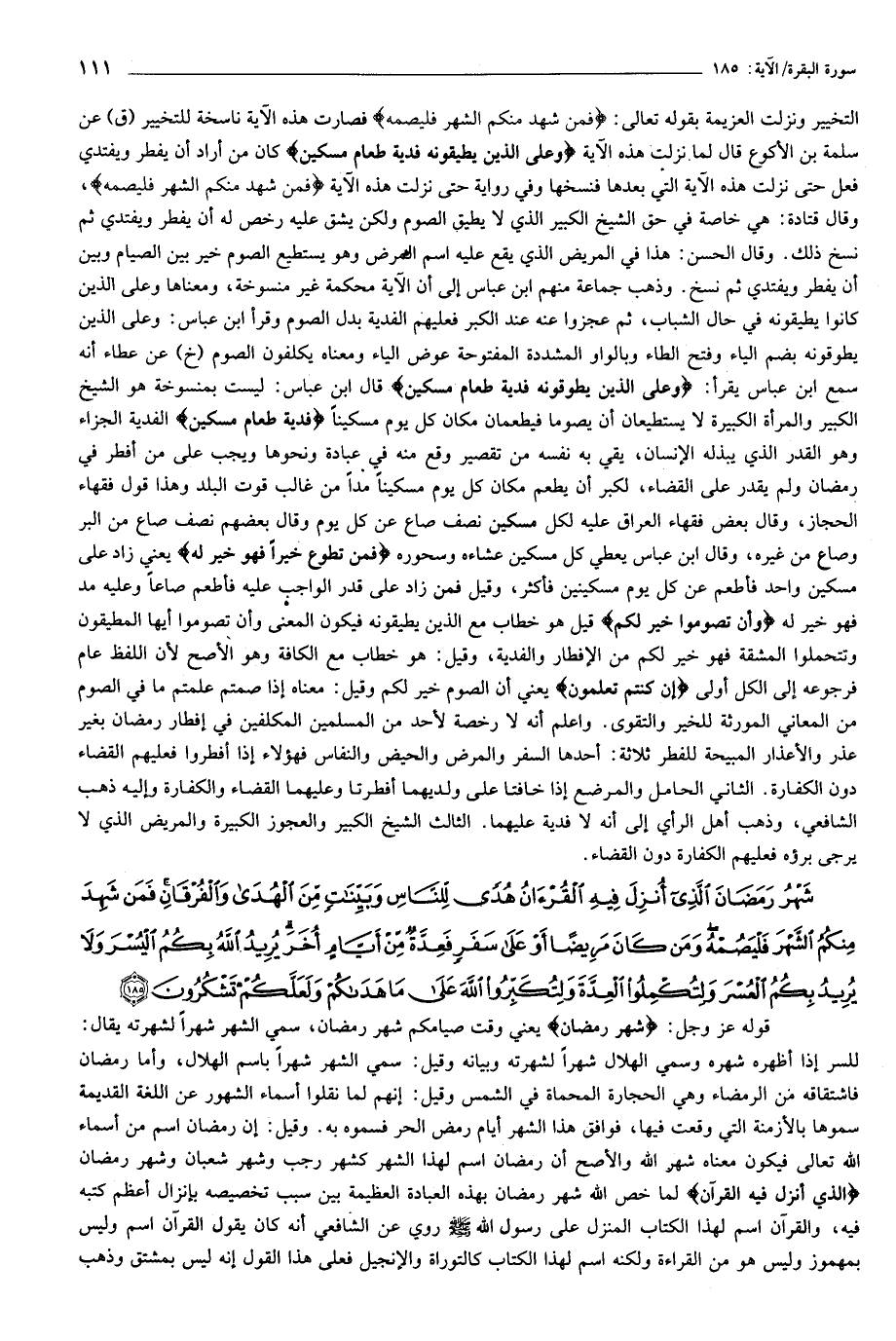 شَهْرُ رَمَضانَ الَّذِي أُنْزِلَ فِيهِ الْقُرْآنُ هُدىً لِلنَّاسِ وَبَيِّناتٍ مِنَ الْهُدى وَالْفُرْقانِ فَمَنْ شَهِدَ مِنْكُمُ الشَّهْرَ فَلْيَصُمْهُ وَمَنْ كانَ مَرِيضاً أَوْ عَلى سَفَرٍ فَعِدَّةٌ مِنْ أَيَّامٍ أُخَرَ يُرِيدُ اللَّهُ بِكُمُ الْيُسْرَ وَلا يُرِيدُ بِكُمُ الْعُسْرَ وَلِتُكْمِلُوا الْعِدَّةَ وَلِتُكَبِّرُوا اللَّهَ عَلى ما هَداكُمْ وَلَعَلَّكُمْ تَشْكُرُونَ (185)