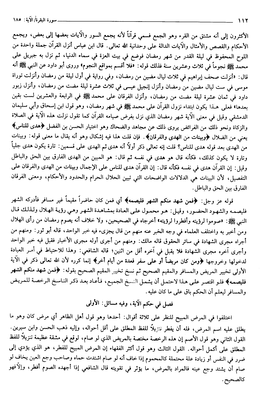 قوله عز وجل: فَمَنْ شَهِدَ مِنْكُمُ الشَّهْرَ فَلْيَصُمْهُ أي فمن كان حاضرا مقيما غير مسافر فأدركه الشهر فليصمه والشهود الحضور، وقيل: هو محمول على العادة بمشاهدة الشهر وهي رؤية الهلال ولذلك قال النبي صلّى الله عليه وسلّم: «صوموا لرؤيته وأفطروا لرؤيته» أخرجاه في الصحيحين، ولا خلاف أنه يصوم رمضان من رأى الهلال ومن أخبر به واختلف العلماء في وجه الخبر عنه منهم من قال يجزئ فيه خبر الواحد، قاله أبو ثور: ومنهم من أجراه مجرى الشهادة في سائر الحقوق قاله مالك: ومنهم من أجرى أوله مجرى الأخبار فقبل فيه خبر الواحد وأجرى آخره مجرى الشهادة فلا يقبل في آخر أقل من اثنين قاله الشافعي: وهذا للاحتياط في أمر العبادة لدخولها وخروجها وَمَنْ كانَ مَرِيضاً أَوْ عَلى سَفَرٍ فَعِدَّةٌ مِنْ أَيَّامٍ أُخَرَ إنما كرره لأن الله تعالى ذكر في الآية الأولى تخيير المريض والمسافر والمقيم الصحيح ثم نسخ تخيير المقيم الصحيح بقوله: فَمَنْ شَهِدَ مِنْكُمُ الشَّهْرَ فَلْيَصُمْهُ فلو اقتصر على هذا لاحتمل أن يشمل النسخ الجميع، فأعاد بعد ذكر الناسخ الرخصة للمريض والمسافر ليعلم أن الحكم باق على ما كان عليه.
