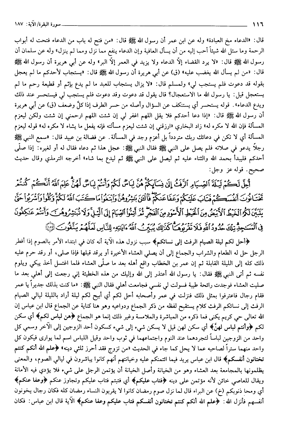 أُحِلَّ لَكُمْ لَيْلَةَ الصِّيامِ الرَّفَثُ إِلى نِسائِكُمْ هُنَّ لِباسٌ لَكُمْ وَأَنْتُمْ لِباسٌ لَهُنَّ عَلِمَ اللَّهُ أَنَّكُمْ كُنْتُمْ تَخْتانُونَ أَنْفُسَكُمْ فَتابَ عَلَيْكُمْ وَعَفا عَنْكُمْ فَالْآنَ بَاشِرُوهُنَّ وَابْتَغُوا ما كَتَبَ اللَّهُ لَكُمْ وَكُلُوا وَاشْرَبُوا حَتَّى يَتَبَيَّنَ لَكُمُ الْخَيْطُ الْأَبْيَضُ مِنَ الْخَيْطِ الْأَسْوَدِ مِنَ الْفَجْرِ ثُمَّ أَتِمُّوا الصِّيامَ إِلَى اللَّيْلِ وَلا تُبَاشِرُوهُنَّ وَأَنْتُمْ عاكِفُونَ فِي الْمَساجِدِ تِلْكَ حُدُودُ اللَّهِ فَلا تَقْرَبُوها كَذلِكَ يُبَيِّنُ اللَّهُ آياتِهِ لِلنَّاسِ لَعَلَّهُمْ يَتَّقُونَ (187)