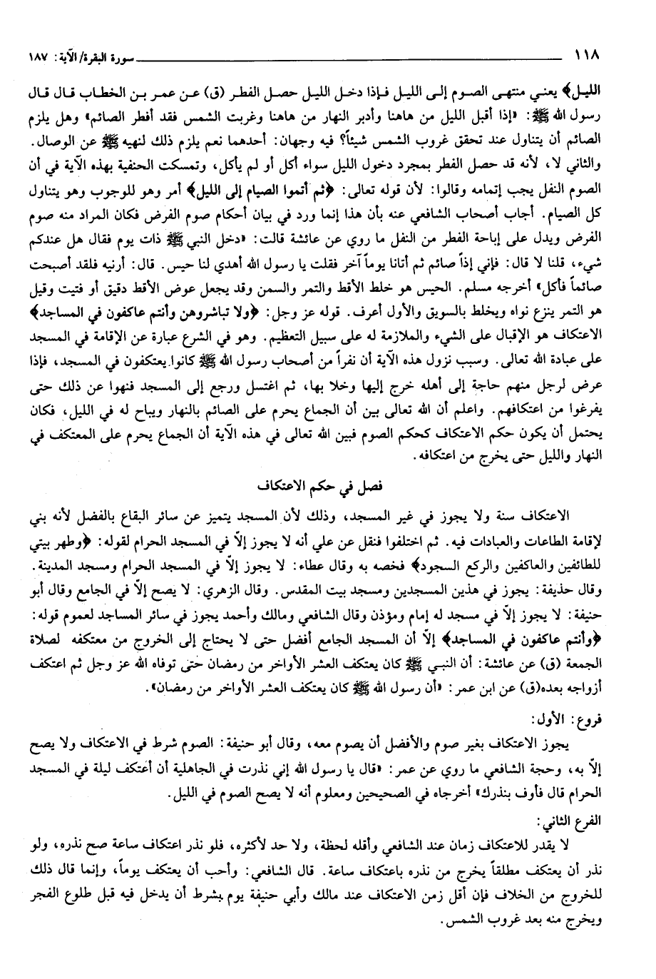 والثاني لا، لأنه قد حصل الفطر بمجرد دخول الليل سواء أكل أو لم يأكل، وتمسكت الحنفية بهذه الآية في أن الصوم النفل يجب إتمامه وقالوا: لأن قوله تعالى: ثُمَّ أَتِمُّوا الصِّيامَ إِلَى اللَّيْلِ أمر وهو للوجوب وهو يتناول كل الصيام. أجاب أصحاب الشافعي عنه بأن هذا إنما ورد في بيان أحكام صوم الفرض فكان المراد منه صوم الفرض ويدل على إباحة الفطر من النفل ما روي عن عائشة قالت: «دخل النبي صلّى الله عليه وسلّم ذات يوم فقال هل عندكم شيء، قلنا لا قال: فإني إذا صائم ثم أتانا يوما آخر فقلت يا رسول الله أهدي لنا حيس. قال: أرنيه فلقد أصبحت صائما فأكل» أخرجه مسلم. الحيس هو خلط الأقط والتمر والسمن وقد يجعل عوض الأقط دقيق أو فتيت وقيل هو التمر ينزع نواه ويخلط بالسويق والأول أعرف. قوله عز وجل: وَلا تُبَاشِرُوهُنَّ وَأَنْتُمْ عاكِفُونَ فِي الْمَساجِدِ الاعتكاف هو الإقبال على الشيء والملازمة له على سبيل التعظيم. وهو في الشرع عبارة عن الإقامة في المسجد على عبادة الله تعالى. وسبب نزول هذه الآية أن نفرا من أصحاب رسول الله صلّى الله عليه وسلّم كانوا يعتكفون في المسجد، فإذا عرض لرجل منهم حاجة إلى أهله خرج إليها وخلا بها، ثم اغتسل ورجع إلى المسجد فنهوا عن ذلك حتى يفرغوا من اعتكافهم. واعلم أن الله تعالى بين أن الجماع يحرم على الصائم بالنهار ويباح له في الليل، فكان يحتمل أن يكون حكم الاعتكاف كحكم الصوم فبين الله تعالى في هذه الآية أن الجماع يحرم على المعتكف في النهار والليل حتى يخرج من اعتكافه.