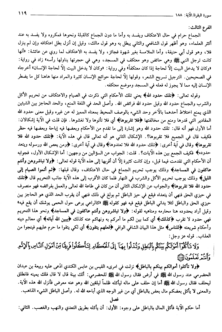 أما الأول فهو أنه قال: تلك حدود الله وهو إشارة إلى ما تقدم من الأحكام وبعضها فيه إباحة وبعضها فيه حظر فكيف قال في الجميع فلا تقربوها؟. الإشكال الثاني هو أنه تعالى قال في هذه الآية: تِلْكَ حُدُودُ اللَّهِ فَلا تَقْرَبُوها وقال في آية أخرى: تِلْكَ حُدُودُ اللَّهِ فَلا تَعْتَدُوها وقال في آية أخرى: وَمَنْ يَعْصِ اللَّهَ وَرَسُولَهُ وَيَتَعَدَّ حُدُودَهُ فكيف الجمع بين هذه الآيات؟. قلت: الجواب عن السؤالين من وجهين: أما الإشكال الأول، فجوابه أن الأحكام التي تقدمت فيما قبل، وإن كانت كثيرة إلّا أن أقربها إلى هذه الآية قوله تعالى: وَلا تُبَاشِرُوهُنَّ وَأَنْتُمْ عاكِفُونَ فِي الْمَساجِدِ وذلك يوجب تحريم الجماع في حال الاعتكاف، وقال قبلها: ثُمَّ أَتِمُّوا الصِّيامَ إِلَى اللَّيْلِ وذلك يوجب تحريم الأكل والشرب في النهار فلما كان الأقرب إلى هذه الآية جانب التحريم قال تِلْكَ حُدُودُ اللَّهِ فَلا تَقْرَبُوها والجواب عن الإشكال الثاني أن من كان في طاعة الله تعالى والعمل بفرائضه فهو منصرف في حيزي الحق فنهي أن يتعداه فيقع في حيز الباطل ثم بولغ في ذلك فنهي أن يقرب الحد الذي هو الحاجز بين حيزي الحق والباطل لئلا يداني الباطل فيقع فيه فهو كقوله صلّى الله عليه وسلّم «كالراعي يرعى حول الحمى يوشك أن يقع فيه» وقيل أراد بحدوده هنا محارمه ومناهيه لقوله: وَلا تُبَاشِرُوهُنَّ وَأَنْتُمْ عاكِفُونَ فِي الْمَساجِدِ ونحو هذا التحريم فهي حدود لا تقرب كَذلِكَ أي كما بين لكم ما أمركم به ونهاكم عنه كذلك يُبَيِّنُ اللَّهُ آياتِهِ أي معالم دينه وأحكام شريعته لِلنَّاسِ مثل هذا البيان الشافي الوافي لَعَلَّهُمْ يَتَّقُونَ أي لكي يتقوا ما حرم عليهم فينجوا من العذاب. قوله عز وجل: