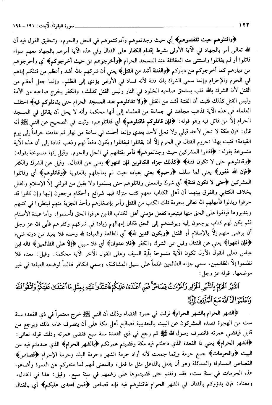 وَاقْتُلُوهُمْ حَيْثُ ثَقِفْتُمُوهُمْ أي حيث وجدتموهم وأدركتموهم في الحل والحرم، وتحقيق القول فيه أن الله تعالى أمر بالجهاد في الآية الأولى بشرط إقدام الكفار على القتال وفي هذه الآية أمرهم بالجهاد معهم سواء قاتلوا أو لم يقاتلوا واستثنى منه المقاتلة عند المسجد الحرام وَأَخْرِجُوهُمْ مِنْ حَيْثُ أَخْرَجُوكُمْ أي وأخرجوهم من ديارهم كما أخرجوكم من دياركم وَالْفِتْنَةُ أَشَدُّ مِنَ الْقَتْلِ يعني أن شركهم بالله أشد وأعظم من قتلكم إياهم في الحرم والإحرام وإنما سمي الشرك بالله فتنة لأنه فساد في الأرض يؤدي إلى الظلم. وإنما جعل أعظم من القتل لأن الشرك بالله ذنب يستحق صاحبه الخلود في النار وليس القتل كذلك، والكفر يخرج صاحبه من الأمة وليس القتل كذلك فثبت أن الفتنة أشد من القتل وَلا تُقاتِلُوهُمْ عِنْدَ الْمَسْجِدِ الْحَرامِ حَتَّى يُقاتِلُوكُمْ فِيهِ اختلف العلماء في هذه الآية فذهب مجاهد في جماعة من العلماء إلى أنها محكمة وأنه لا يحل أن يقاتل في المسجد الحرام إلّا من قاتل فيه وهو قوله: فَإِنْ قاتَلُوكُمْ فَاقْتُلُوهُمْ أي فقاتلوهم، وثبت في الصحيح عن النبي صلّى الله عليه وسلّم أنه قال: «إن مكة لا تحل لأحد قبلي ولا تحل لأحد بعدي وإنما أحلت لي ساعة من نهار ثم عادت حراما إلى يوم القيامة» فثبت بهذا تحريم القتال في الحرم إلّا أن يقاتلوا فيقاتلوا ويكون دفعا لهم وذهب قتادة إلى أن هذه الآية منسوخة بقوله: فَاقْتُلُوا الْمُشْرِكِينَ حَيْثُ وَجَدْتُمُوهُمْ فأمر بقتالهم في الحل والحرم. وقيل إنها منسوخة بقوله: