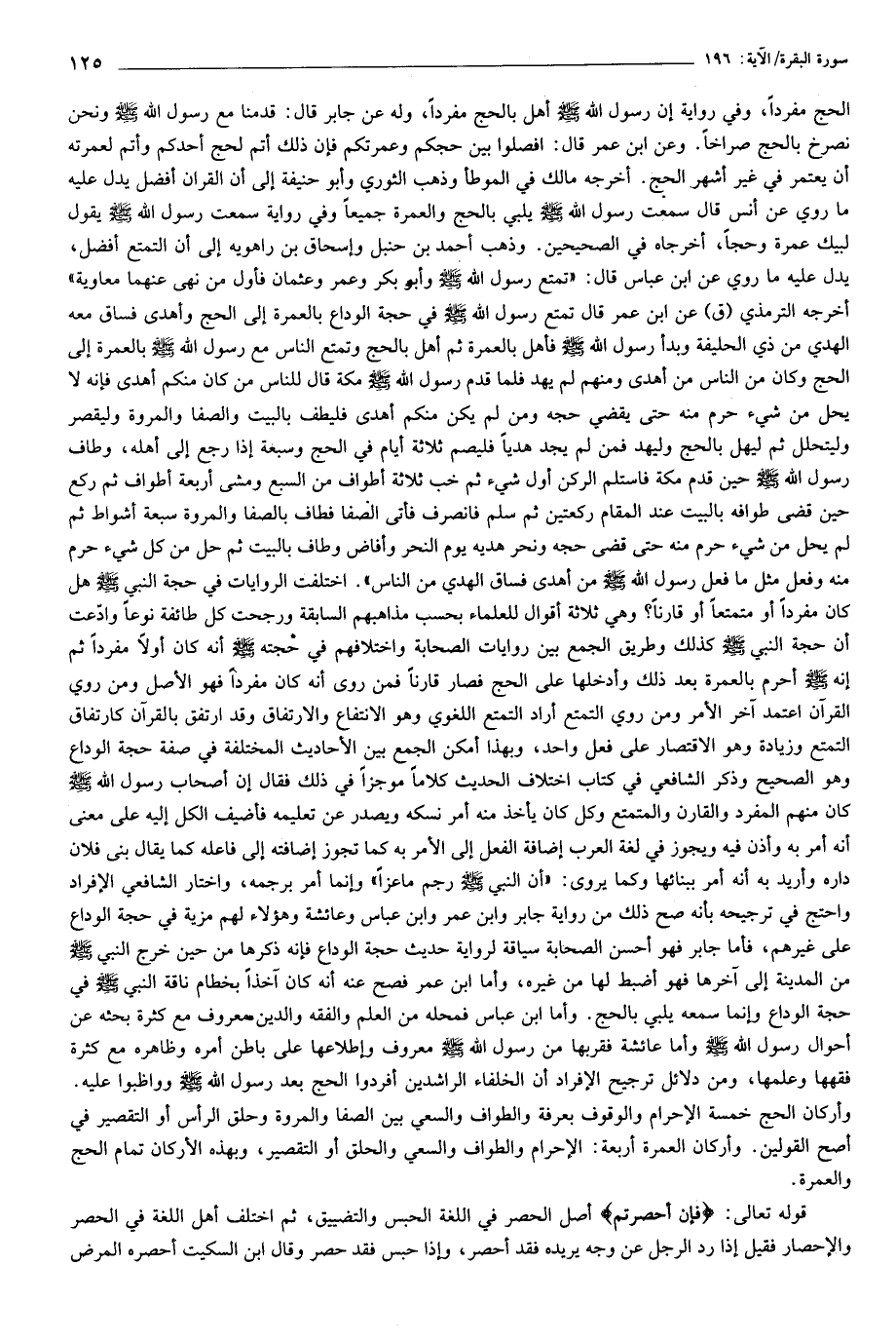 الحج مفردا، وفي رواية إن رسول الله صلّى الله عليه وسلّم أهل بالحج مفردا، وله عن جابر قال: قدمنا مع رسول الله صلّى الله عليه وسلّم ونحن نصرخ بالحج صراخا. وعن ابن عمر قال: افصلوا بين حجكم وعمرتكم فإن ذلك أتم لحج أحدكم وأتم لعمرته أن يعتمر في غير أشهر الحج. أخرجه مالك في الموطأ وذهب الثوري وأبو حنيفة إلى أن القران أفضل يدل عليه ما روي عن أنس قال سمعت رسول الله صلّى الله عليه وسلّم يلبي بالحج والعمرة جميعا وفي رواية سمعت رسول الله صلّى الله عليه وسلّم يقول لبيك عمرة وحجا، أخرجاه في الصحيحين. وذهب أحمد بن حنبل وإسحاق بن راهويه إلى أن التمتع أفضل، يدل عليه ما روي عن ابن عباس قال: «تمتع رسول الله صلّى الله عليه وسلّم وأبو بكر وعمر وعثمان فأول من نهى عنهما معاوية» أخرجه الترمذي (ق) عن ابن عمر قال تمتع رسول الله صلّى الله عليه وسلّم في حجة الوداع بالعمرة إلى الحج وأهدى فساق معه الهدي من ذي الحليفة وبدأ رسول الله صلّى الله عليه وسلّم فأهل بالعمرة ثم أهل بالحج وتمتع الناس مع رسول الله صلّى الله عليه وسلّم بالعمرة إلى الحج وكان من الناس من أهدى ومنهم لم يهد فلما قدم رسول الله صلّى الله عليه وسلّم مكة قال للناس من كان منكم أهدى فإنه لا يحل من شيء حرم منه حتى يقضي حجه ومن لم يكن منكم أهدى فليطف بالبيت والصفا والمروة وليقصر وليتحلل ثم ليهل بالحج وليهد فمن لم يجد هديا فليصم ثلاثة أيام في الحج وسبعة إذا رجع إلى أهله، وطاف رسول الله صلّى الله عليه وسلّم حين قدم مكة فاستلم الركن أول شيء ثم خب ثلاثة أطواف من السبع ومشى أربعة أطواف ثم ركع حين قضى طوافه بالبيت عند المقام ركعتين ثم سلم فانصرف فأتى الصفا فطاف بالصفا والمروة سبعة أشواط ثم لم يحل من شيء حرم منه حتى قضى حجه ونحر هديه يوم النحر وأفاض وطاف بالبيت ثم حل من كل شيء حرم منه وفعل مثل ما فعل رسول الله صلّى الله عليه وسلّم من أهدى فساق الهدي من الناس». اختلفت الروايات في حجة النبي صلّى الله عليه وسلّم هل كان مفردا أو متمتعا أو قارنا؟ وهي ثلاثة أقوال للعلماء بحسب مذاهبهم السابقة ورجحت كل طائفة نوعا وادّعت أن حجة النبي صلّى الله عليه وسلّم كذلك وطريق الجمع بين روايات الصحابة واختلافهم في حجته صلّى الله عليه وسلّم أنه كان أولا مفردا ثم إنه صلّى الله عليه وسلّم أحرم بالعمرة بعد ذلك وأدخلها على الحج فصار قارنا فمن روى أنه كان مفردا فهو الأصل ومن روي القرآن اعتمد آخر الأمر ومن روي التمتع أراد التمتع اللغوي وهو الانتفاع والارتفاق وقد ارتفق بالقرآن كارتفاق التمتع وزيادة وهو الاقتصار على فعل واحد، وبهذا أمكن الجمع بين الأحاديث المختلفة في صفة حجة الوداع وهو الصحيح وذكر الشافعي في كتاب اختلاف الحديث كلاما موجزا في ذلك فقال إن أصحاب رسول الله صلّى الله عليه وسلّم كان منهم المفرد والقارن والمتمتع وكل كان يأخذ منه أمر نسكه ويصدر عن تعليمه فأضيف الكل إليه على معنى أنه أمر به وأذن فيه ويجوز في لغة العرب إضافة الفعل إلى الأمر به كما تجوز إضافته إلى فاعله كما يقال بنى فلان داره وأريد به أنه أمر ببنائها وكما يروى: «أن النبي صلّى الله عليه وسلّم رجم ماعزا» وإنما أمر برجمه، واختار الشافعي الإفراد واحتج في ترجيحه بأنه صح ذلك من رواية جابر وابن عمر وابن عباس وعائشة وهؤلاء لهم مزية في حجة الوداع على غيرهم، فأما جابر فهو أحسن الصحابة سياقة لرواية حديث حجة الوداع فإنه ذكرها من حين خرج النبي صلّى الله عليه وسلم