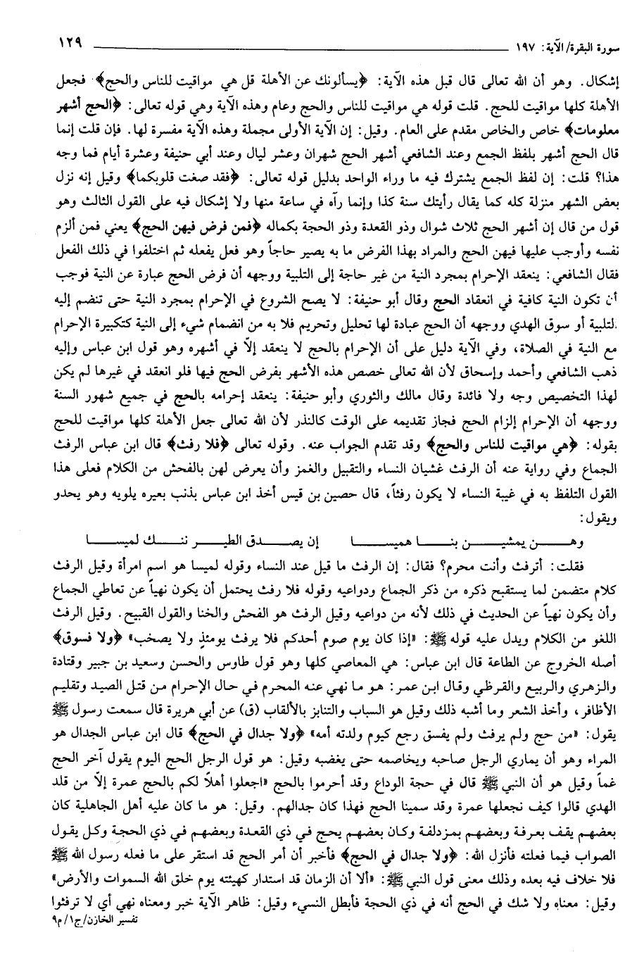 إشكال. وهو أن الله تعالى قال قبل هذه الآية: يَسْئَلُونَكَ عَنِ الْأَهِلَّةِ قُلْ هِيَ مَواقِيتُ لِلنَّاسِ وَالْحَجِّ فجعل الأهلة كلها مواقيت للحج. قلت قوله هي مواقيت للناس والحج وعام وهذه الآية وهي قوله تعالى: الْحَجُّ أَشْهُرٌ مَعْلُوماتٌ خاص والخاص مقدم على العام. وقيل: إن الآية الأولى مجملة وهذه الآية مفسرة لها. فإن قلت إنما قال الحج أشهر بلفظ الجمع وعند الشافعي أشهر الحج شهران وعشر ليال وعند أبي حنيفة وعشرة أيام فما وجه هذا؟ قلت: إن لفظ الجمع يشترك فيه ما وراء الواحد بدليل قوله تعالى: فَقَدْ صَغَتْ قُلُوبُكُما وقيل إنه نزل بعض الشهر منزلة كله كما يقال رأيتك سنة كذا وإنما رآه في ساعة منها ولا إشكال فيه على القول الثالث وهو قول من قال إن أشهر الحج ثلاث شوال وذو القعدة وذو الحجة بكماله فَمَنْ فَرَضَ فِيهِنَّ الْحَجَّ يعني فمن ألزم نفسه وأوجب عليها فيهن الحج والمراد بهذا الفرض ما به يصير حاجا وهو فعل يفعله ثم اختلفوا في ذلك الفعل فقال الشافعي: ينعقد الإحرام بمجرد النية من غير حاجة إلى التلبية ووجهه أن فرض الحج عبارة عن النية فوجب أن تكون النية كافية في انعقاد الحج وقال أبو حنيفة: لا يصح الشروع في الإحرام بمجرد النية حتى تنضم إليه التلبية أو سوق الهدي ووجهه أن الحج عبادة لها تحليل وتحريم فلا به من انضمام شيء إلى النية كتكبيرة الإحرام مع النية في الصلاة، وفي الآية دليل على أن الإحرام بالحج لا ينعقد إلّا في أشهره وهو قول ابن عباس وإليه ذهب الشافعي وأحمد وإسحاق لأن الله تعالى خصص هذه الأشهر بفرض الحج فيها فلو انعقد في غيرها لم يكن لهذا التخصيص وجه ولا فائدة وقال مالك والثوري وأبو حنيفة: ينعقد إحرامه بالحج في جميع شهور السنة ووجهه أن الإحرام إلزام الحج فجاز تقديمه على الوقت كالنذر لأن الله تعالى جعل الأهلة كلها مواقيت للحج بقوله: هِيَ مَواقِيتُ لِلنَّاسِ وَالْحَجِّ وقد تقدم الجواب عنه. وقوله تعالى فَلا رَفَثَ قال ابن عباس الرفث الجماع وفي رواية عنه أن الرفث غشيان النساء والتقبيل والغمز وأن يعرض لهن بالفحش من الكلام فعلى هذا القول التلفظ به في غيبة النساء لا يكون رفثا، قال حصين بن قيس أخذ ابن عباس بذنب بعيره يلويه وهو يحدو ويقول:
