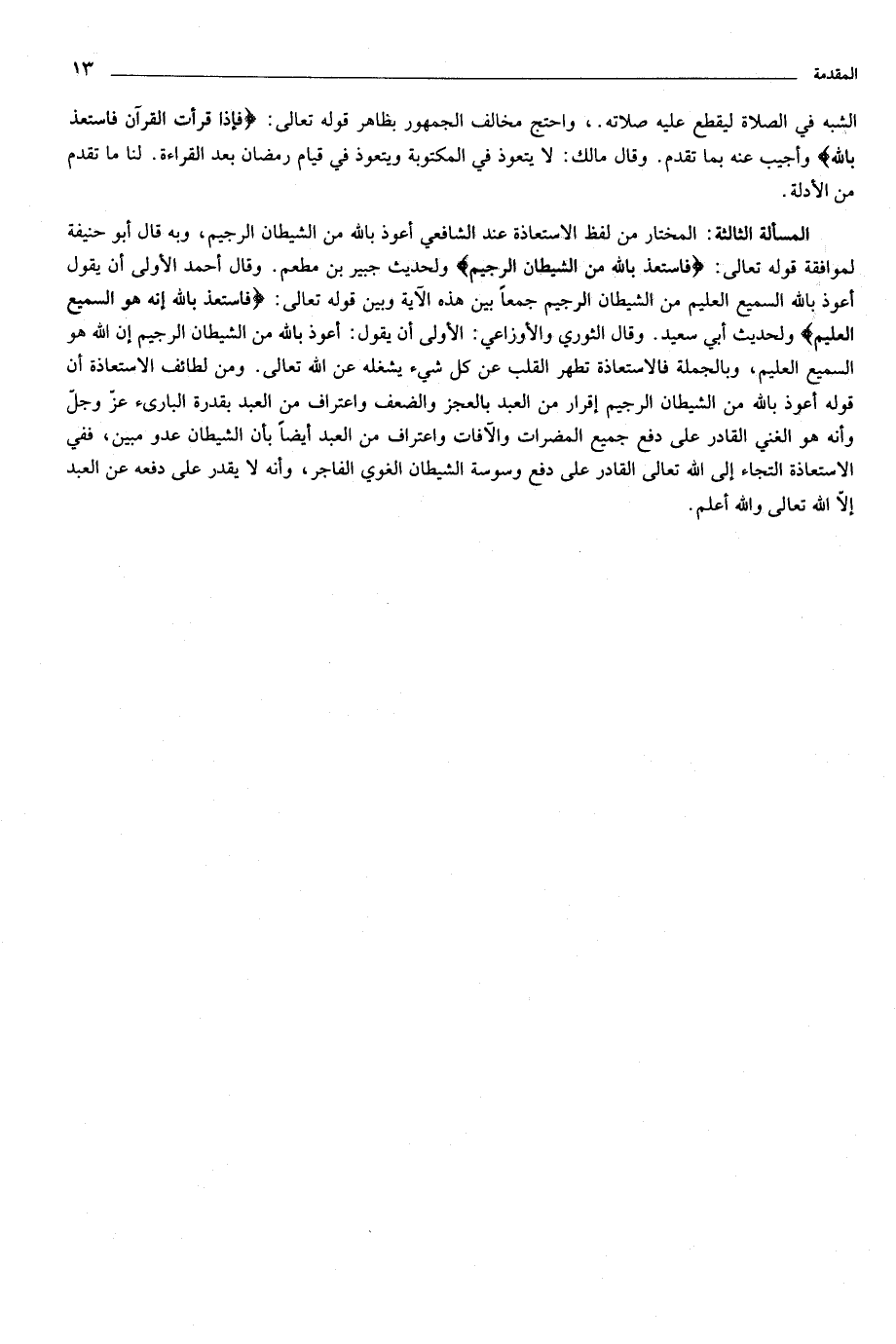 المسألة الثالثة: المختار من لفظ الاستعاذة عند الشافعي أعوذ بالله من الشيطان الرجيم، وبه قال أبو حنيفة لموافقة قوله تعالى: فَاسْتَعِذْ بِاللَّهِ مِنَ الشَّيْطانِ الرَّجِيمِ ولحديث جبير بن مطعم. وقال أحمد الأولى أن يقول أعوذ بالله السميع العليم من الشيطان الرجيم جمعا بين هذه الآية وبين قوله تعالى: فَاسْتَعِذْ بِاللَّهِ إِنَّهُ هُوَ السَّمِيعُ الْعَلِيمُ ولحديث أبي سعيد. وقال الثوري والأوزاعي: الأولى أن يقول: أعوذ بالله من الشيطان الرجيم إن الله هو السميع العليم، وبالجملة فالاستعاذة تطهر القلب عن كل شيء يشغله عن الله تعالى. ومن لطائف الاستعاذة أن قوله أعوذ بالله من الشيطان الرجيم إقرار من العبد بالعجز والضعف واعتراف من العبد بقدرة البارئ عزّ وجلّ وأنه هو الغني القادر على دفع جميع المضرات والآفات واعتراف من العبد أيضا بأن الشيطان عدو مبين، ففي الاستعاذة التجاء إلى الله تعالى القادر على دفع وسوسة الشيطان الغوي الفاجر، وأنه لا يقدر على دفعه عن العبد إلّا الله تعالى والله أعلم.