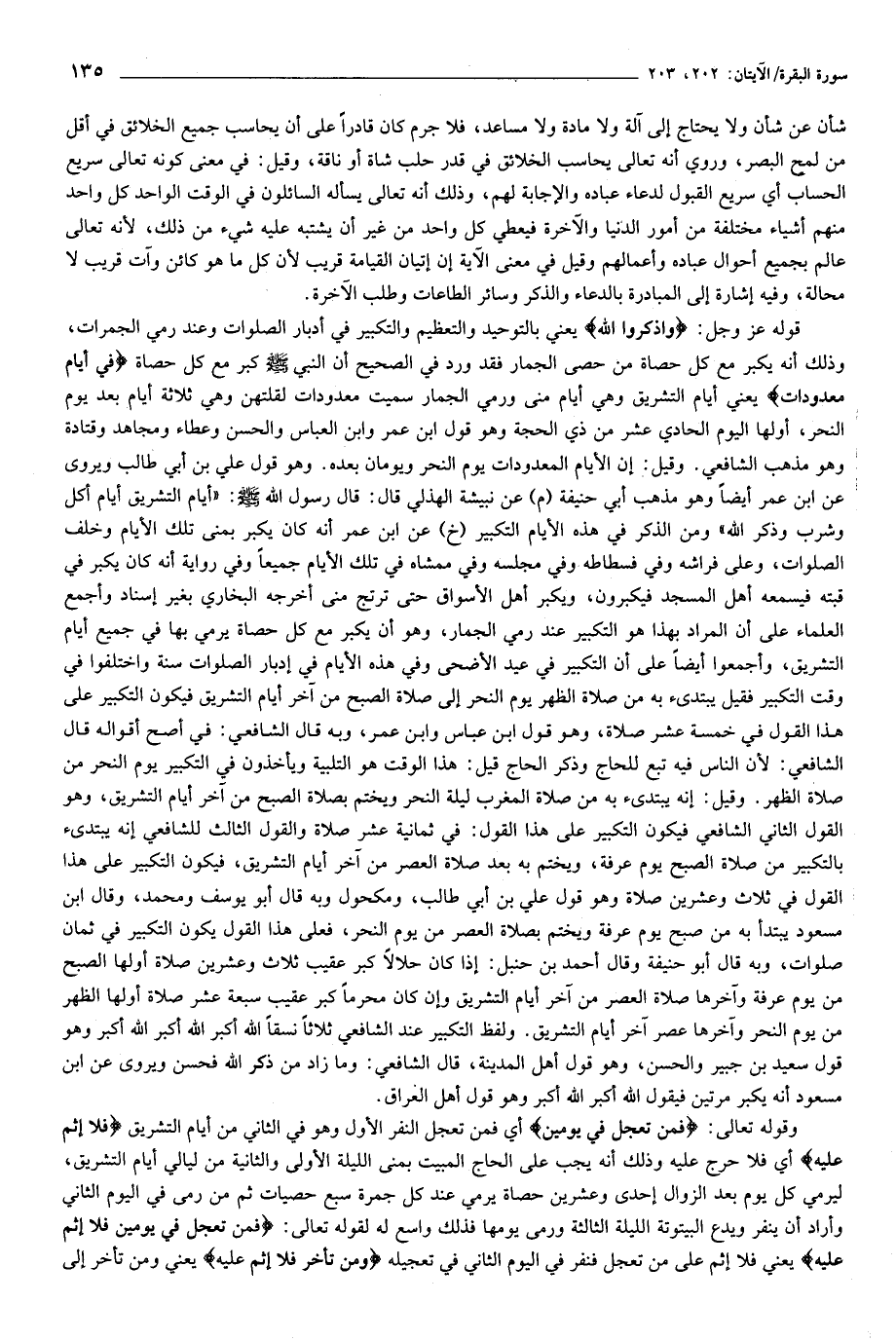 قوله عز وجل: وَاذْكُرُوا اللَّهَ يعني بالتوحيد والتعظيم والتكبير في أدبار الصلوات وعند رمي الجمرات، وذلك أنه يكبر مع كل حصاة من حصى الجمار فقد ورد في الصحيح أن النبي صلّى الله عليه وسلّم كبر مع كل حصاة فِي أَيَّامٍ مَعْدُوداتٍ يعني أيام التشريق وهي أيام منى ورمي الجمار سميت معدودات لقلتهن وهي ثلاثة أيام بعد يوم النحر، أولها اليوم الحادي عشر من ذي الحجة وهو قول ابن عمر وابن العباس والحسن وعطاء ومجاهد وقتادة وهو مذهب الشافعي. وقيل: إن الأيام المعدودات يوم النحر ويومان بعده. وهو قول علي بن أبي طالب ويروى عن ابن عمر أيضا وهو مذهب أبي حنيفة (م) عن نبيشة الهذلي قال: قال رسول الله صلّى الله عليه وسلّم: «أيام التشريق أيام أكل وشرب وذكر الله» ومن الذكر في هذه الأيام التكبير (خ) عن ابن عمر أنه كان يكبر بمنى تلك الأيام وخلف الصلوات، وعلى فراشه وفي فسطاطه وفي مجلسه وفي ممشاه في تلك الأيام جميعا وفي رواية أنه كان يكبر في قبته فيسمعه أهل المسجد فيكبرون، ويكبر أهل الأسواق حتى ترتج منى أخرجه البخاري بغير إسناد وأجمع العلماء على أن المراد بهذا هو التكبير عند رمي الجمار، وهو أن يكبر مع كل حصاة يرمي بها في جميع أيام التشريق، وأجمعوا أيضا على أن التكبير في عيد الأضحى وفي هذه الأيام في إدبار الصلوات سنة واختلفوا في وقت التكبير فقيل يبتدئ به من صلاة الظهر يوم النحر إلى صلاة الصبح من آخر أيام التشريق فيكون التكبير على هذا القول في خمسة عشر صلاة، وهو قول ابن عباس وابن عمر، وبه قال الشافعي: في أصح أقواله قال الشافعي: لأن الناس فيه تبع للحاج وذكر الحاج قيل: هذا الوقت هو التلبية ويأخذون في التكبير يوم النحر من صلاة الظهر. وقيل: إنه يبتدئ به من صلاة المغرب ليلة النحر ويختم بصلاة الصبح من آخر أيام التشريق، وهو القول الثاني الشافعي فيكون التكبير على هذا القول: في ثمانية عشر صلاة والقول الثالث للشافعي إنه يبتدئ بالتكبير من صلاة الصبح يوم عرفة، ويختم به بعد صلاة العصر من آخر أيام التشريق، فيكون التكبير على هذا القول في ثلاث وعشرين صلاة وهو قول علي بن أبي طالب، ومكحول وبه قال أبو يوسف ومحمد، وقال ابن مسعود يبتدأ به من صبح يوم عرفة ويختم بصلاة العصر من يوم النحر، فعلى هذا القول يكون التكبير في ثمان صلوات، وبه قال أبو حنيفة وقال أحمد بن حنبل: إذا كان حلالا كبر عقيب ثلاث وعشرين صلاة أولها الصبح من يوم عرفة وآخرها صلاة العصر من آخر أيام التشريق وإن كان محرما كبر عقيب سبعة عشر صلاة أولها الظهر من يوم النحر وآخرها عصر آخر أيام التشريق. ولفظ التكبير عند الشافعي ثلاثا نسقا الله أكبر الله أكبر الله أكبر وهو قول سعيد بن جبير والحسن، وهو قول أهل المدينة، قال الشافعي: وما زاد من ذكر الله فحسن ويروى عن ابن مسعود أنه يكبر مرتين فيقول الله أكبر الله أكبر وهو قول أهل العراق.