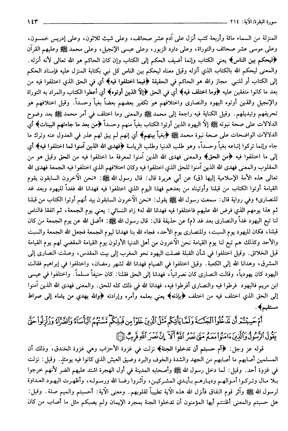 والمعنى ليحكم الله بالكتاب الذي أنزله وقيل معناه ليحكم بين الناس كل نبي بكتابة المنزل عليه فإسناد الحكم إلى الكتاب أو للنبي مجاز والله هو الحاكم في الحقيقة فِيمَا اخْتَلَفُوا فِيهِ أي في الحق الذي اختلفوا فيه من بعد ما كانوا متفقين عليه وَمَا اخْتَلَفَ فِيهِ أي في الحق إِلَّا الَّذِينَ أُوتُوهُ أي أعطوا الكتاب والمراد به التوراة والإنجيل والذين أوتوه اليهود والنصارى واختلافهم هو تكفير بعضهم بعضا بغيا وحسدا. وقيل اختلافهم هو تحريفهم وتبديلهم. وقيل الكناية فيه راجعة إلى محمد صلّى الله عليه وسلّم والمعنى وما اختلف في أمر محمد صلّى الله عليه وسلّم بعد وضوح الدلالات على صحة نبوته صلّى الله عليه وسلّم إلّا اليهود الذين أوتوا الكتاب بغيا منهم وحسدا مِنْ بَعْدِ ما جاءَتْهُمُ الْبَيِّناتُ أي الدلالات الواضحات على صحة نبوة محمد صلّى الله عليه وسلّم بَغْياً بَيْنَهُمْ أي إنهم لم يبق لهم عذر في العدول عنه وترك ما جاء وإنما تركوا إتباعه بغيا وحسدا، وهو طلب الدنيا وطلب الرياسة فَهَدَى اللَّهُ الَّذِينَ آمَنُوا لِمَا اخْتَلَفُوا فِيهِ أي إلى ما اختلفوا فيه مِنَ الْحَقِّ والمعنى فهدى الله الذين آمنوا لمعرفة ما اختلفوا فيه من الحق وقيل هو من المقلوب والمعنى فهدى الله الذين آمنوا للحق الذي اختلفوا فيه وكان اختلافهم الذي اختلفوا فيه الجمعة فهدى الله تعالى هذه الأمة الإسلامية إليها (ق) عن أبي هريرة قال: قال رسول الله صلّى الله عليه وسلّم: «نحن الآخرون السابقون يقوم القيامة أوتوا الكتاب من قبلنا وأوتيناه من بعدهم فهذا اليوم الذي اختلفوا فيه فهدانا الله فغدا لليهود وبعد غد للنصارى» وفي رواية قال: سمعت رسول الله صلّى الله عليه وسلّم يقول: «نحن الآخرون السابقون بيد أنهم أوتوا الكتاب من قبلنا ثم هذا يومهم الذي فرض الله عليهم فاختلفوا فيه فهدانا الله له» زاد النسائي: يعني يوم الجمعة، ثم اتفقا فالناس لنا تبع اليهود غدا والنصارى بعد غد (م) عن حذيفة قال: قال رسول الله صلّى الله عليه وسلّم: «أضل الله عن يوم الجمعة من كان قبلنا، فكان لليهود يوم السبت، وللنصارى يوم الأحد، فجاء الله بنا فهدانا ليوم الجمعة فجعل الله الجمعة والسبت والأحد وكذلك هم تبع لنا يوم القيامة نحن الآخرون من أهل الدنيا الأولون يوم القيامة المقضي لهم يوم القيامة قبل الخلائق. وقيل اختلفوا في شأن القبلة فصلت اليهود نحو المغرب إلى بيت المقدس، وصلت النصارى إلى المشرق، وهدانا الله إلى الكعبة. وقيل اختلفوا في الصيام فهدانا الله لشهر رمضان، واختلفوا في إبراهيم فقالت اليهود كان يهوديا، وقالت النصارى كان نصرانيا، فهدانا إلى الحق فقلنا: كان حنيفا مسلما. واختلفوا في عيسى ابن مريم فاليهود فرطوا فيه والنصارى أفرطوا فيه، فهدانا الله في ذلك كله للحق. والمعنى فهدى الله الذين آمنوا إلى الحق الذي اختلف فيه من اختلف بِإِذْنِهِ يعني بعلمه وأمره وإرادته وَاللَّهُ يَهْدِي مَنْ يَشاءُ إِلى صِراطٍ مُسْتَقِيمٍ.