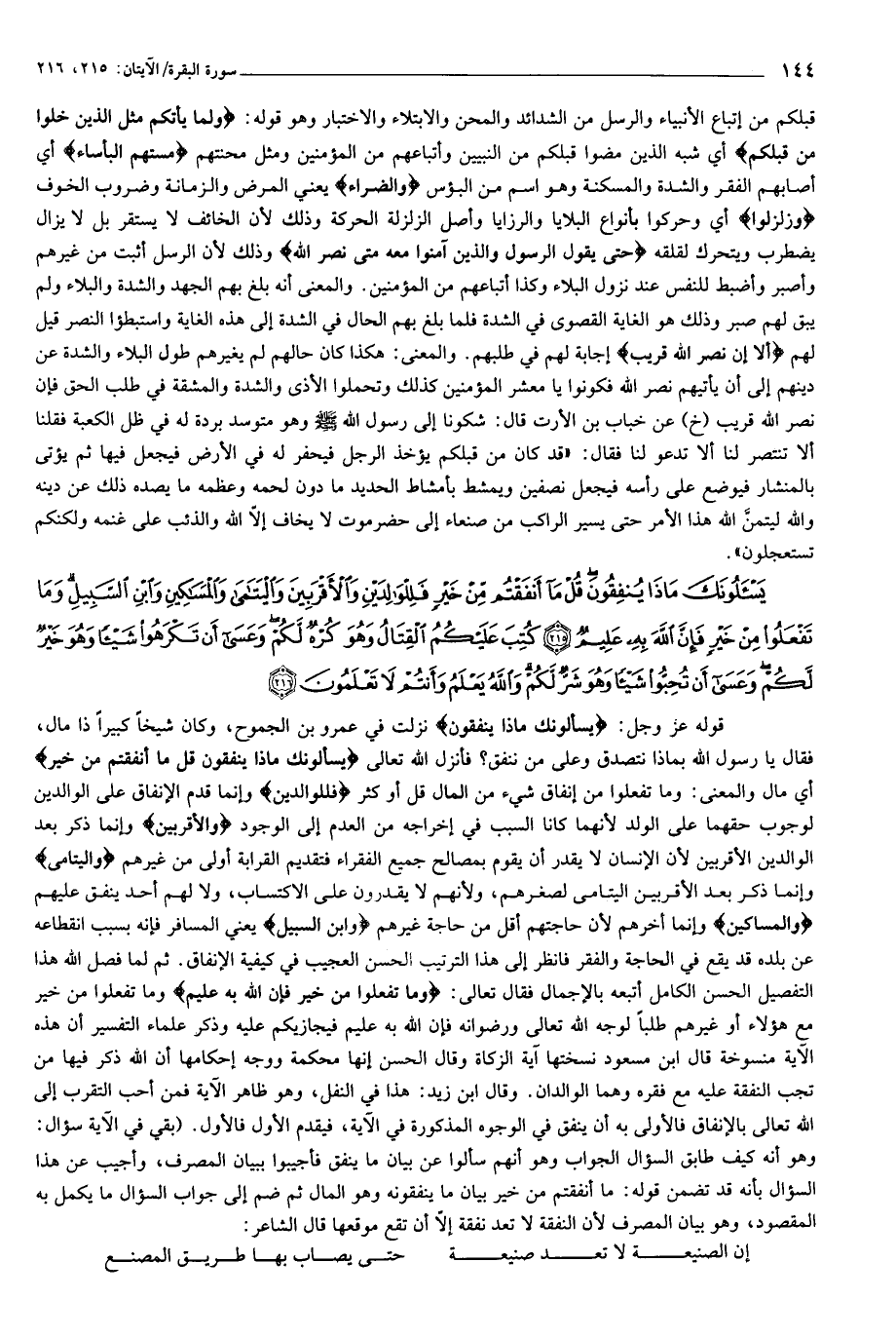 يَسْئَلُونَكَ ماذا يُنْفِقُونَ قُلْ ما أَنْفَقْتُمْ مِنْ خَيْرٍ فَلِلْوالِدَيْنِ وَالْأَقْرَبِينَ وَالْيَتامى وَالْمَساكِينِ وَابْنِ السَّبِيلِ وَما تَفْعَلُوا مِنْ خَيْرٍ فَإِنَّ اللَّهَ بِهِ عَلِيمٌ (215) كُتِبَ عَلَيْكُمُ الْقِتالُ وَهُوَ كُرْهٌ لَكُمْ وَعَسى أَنْ تَكْرَهُوا شَيْئاً وَهُوَ خَيْرٌ لَكُمْ وَعَسى أَنْ تُحِبُّوا شَيْئاً وَهُوَ شَرٌّ لَكُمْ وَاللَّهُ يَعْلَمُ وَأَنْتُمْ لا تَعْلَمُونَ (216)