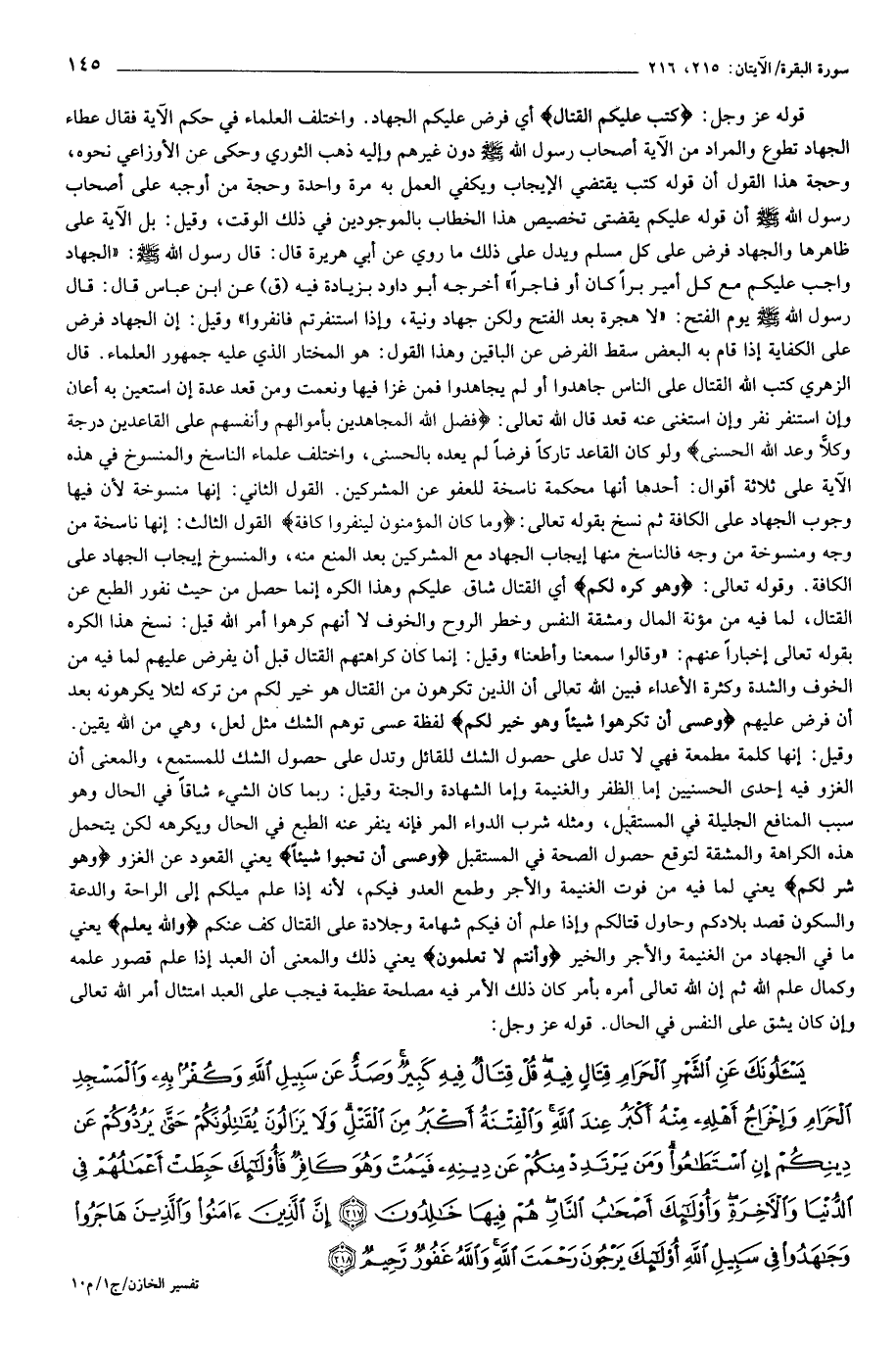 قوله عز وجل: كُتِبَ عَلَيْكُمُ الْقِتالُ أي فرض عليكم الجهاد. واختلف العلماء في حكم الآية فقال عطاء الجهاد تطوع والمراد من الآية أصحاب رسول الله صلّى الله عليه وسلّم دون غيرهم وإليه ذهب الثوري وحكى عن الأوزاعي نحوه، وحجة هذا القول أن قوله كتب يقتضي الإيجاب ويكفي العمل به مرة واحدة وحجة من أوجبه على أصحاب رسول الله صلّى الله عليه وسلّم أن قوله عليكم يقتضى تخصيص هذا الخطاب بالموجودين في ذلك الوقت، وقيل: بل الآية على ظاهرها والجهاد فرض على كل مسلم ويدل على ذلك ما روي عن أبي هريرة قال: قال رسول الله صلّى الله عليه وسلّم: «الجهاد واجب عليكم مع كل أمير برا كان أو فاجرا» أخرجه أبو داود بزيادة فيه (ق) عن ابن عباس قال: قال رسول الله صلّى الله عليه وسلّم يوم الفتح: «لا هجرة بعد الفتح ولكن جهاد ونية، وإذا استنفرتم فانفروا» وقيل: إن الجهاد فرض على الكفاية إذا قام به البعض سقط الفرض عن الباقين وهذا القول: هو المختار الذي عليه جمهور العلماء. قال الزهري كتب الله القتال على الناس جاهدوا أو لم يجاهدوا فمن غزا فيها ونعمت ومن قعد عدة إن استعين به أعان وإن استنفر نفر وإن استغنى عنه قعد قال الله تعالى: فَضَّلَ اللَّهُ الْمُجاهِدِينَ بِأَمْوالِهِمْ وَأَنْفُسِهِمْ عَلَى الْقاعِدِينَ دَرَجَةً وَكُلًّا وَعَدَ اللَّهُ الْحُسْنى ولو كان القاعد تاركا فرضا لم يعده بالحسنى، واختلف علماء الناسخ والمنسوخ في هذه الآية على ثلاثة أقوال: أحدها أنها محكمة ناسخة للعفو عن المشركين. القول الثاني: إنها منسوخة لأن فيها وجوب الجهاد على الكافة ثم نسخ بقوله تعالى: وَما كانَ الْمُؤْمِنُونَ لِيَنْفِرُوا كَافَّةً القول الثالث: إنها ناسخة من وجه ومنسوخة من وجه فالناسخ منها إيجاب الجهاد مع المشركين بعد المنع منه، والمنسوخ إيجاب الجهاد على الكافة. وقوله تعالى: وَهُوَ كُرْهٌ لَكُمْ أي القتال شاق عليكم وهذا الكره إنما حصل من حيث نفور الطبع عن القتال، لما فيه من مؤنة المال ومشقة النفس وخطر الروح والخوف لا أنهم كرهوا أمر الله قيل: نسخ هذا الكره بقوله تعالى إخبارا عنهم: «وقالوا سمعنا وأطعنا» وقيل: إنما كان كراهتهم القتال قبل أن يفرض عليهم لما فيه من الخوف والشدة وكثرة الأعداء فبين الله تعالى أن الذين تكرهون من القتال هو خير لكم من تركه لئلا يكرهونه بعد أن فرض عليهم وَعَسى أَنْ تَكْرَهُوا شَيْئاً وَهُوَ خَيْرٌ لَكُمْ لفظة عسى توهم الشك مثل لعل، وهي من الله يقين.