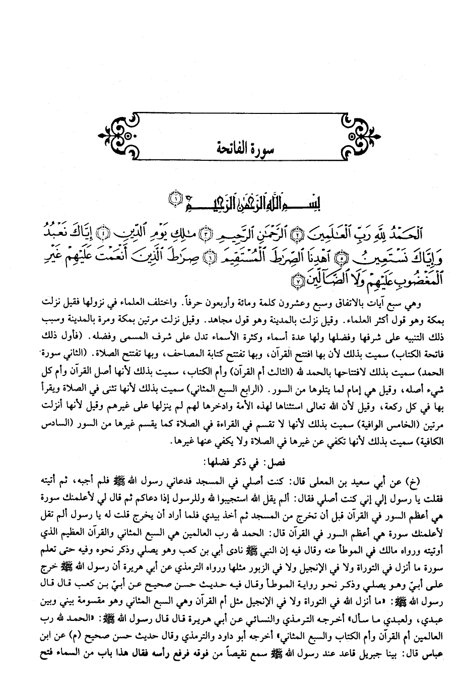 وهي سبع آيات بالاتفاق وسبع وعشرون كلمة ومائة وأربعون حرفا. واختلف العلماء في نزولها فقيل نزلت بمكة وهو قول أكثر العلماء. وقيل نزلت بالمدينة وهو قول مجاهد. وقيل نزلت مرتين بمكة ومرة بالمدينة وسبب ذلك التنبيه على شرفها وفضلها ولها عدة أسماء وكثرة الأسماء تدل على شرف المسمى وفضله. (فأول ذلك فاتحة الكتاب) سميت بذلك لأن بها افتتح القرآن، وبها تفتتح كتابة المصاحف، وبها تفتتح الصلاة. (الثاني سورة الحمد) سميت بذلك لافتتاحها بالحمد لله (الثالث أم القرآن) وأم الكتاب، سميت بذلك لأنها أصل القرآن وأم كل شيء أصله، وقيل هي إمام لما يتلوها من السور. (الرابع السبع المثاني) سميت بذلك لأنها تثنى في الصلاة ويقرأ بها في كل ركعة، وقيل لأن الله تعالى استثناها لهذه الأمة وادخرها لهم لم ينزلها على غيرهم وقيل لأنها أنزلت مرتين (الخامس الوافية) سميت بذلك لأنها لا تقسم في القراءة في الصلاة كما يقسم غيرها من السور (السادس الكافية) سميت بذلك لأنها تكفي عن غيرها في الصلاة ولا يكفي عنها غيرها.