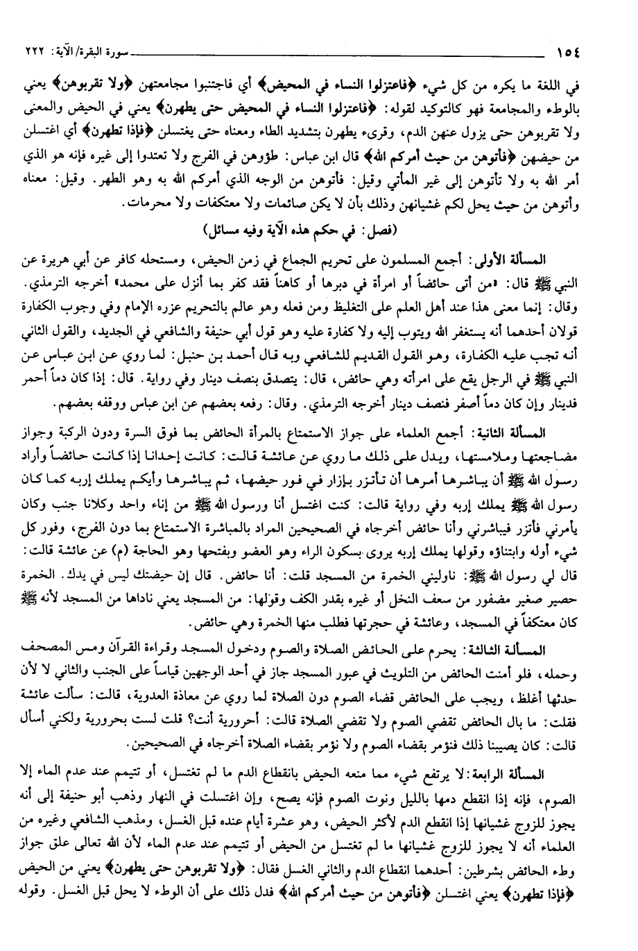 (فصل: في حكم هذه الآية وفيه مسائل) المسألة الأولى: أجمع المسلمون على تحريم الجماع في زمن الحيض، ومستحله كافر عن أبي هريرة عن النبي صلّى الله عليه وسلّم قال: «من أتى حائضا أو امرأة في دبرها أو كاهنا فقد كفر بما أنزل على محمد» أخرجه الترمذي.