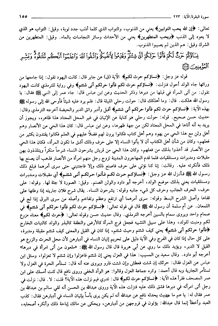 قوله عز وجل: نِساؤُكُمْ حَرْثٌ لَكُمْ الآية (ق) عن جابر قال: كانت اليهود تقول: إذا جامعها من ورائها جاء الولد أحول فنزلت: نِساؤُكُمْ حَرْثٌ لَكُمْ فَأْتُوا حَرْثَكُمْ أَنَّى شِئْتُمْ وفي رواية للترمذي كانت اليهود تقول: من أتى المرأة في قبلها من دبرها وذكر الحديث وعن ابن عباس قال: جاء عمر إلى النبي صلّى الله عليه وسلّم فقال: يا رسول الله هلكت. قال: وما أهلكك قال: حولت رحلي الليلة قال: فلم يرد عليه شيئا فأوحى الله إلى رسوله صلّى الله عليه وسلّم بهذه الآية: نِساؤُكُمْ حَرْثٌ لَكُمْ فَأْتُوا حَرْثَكُمْ أَنَّى شِئْتُمْ أقبل وأدبر واتق الدبر والحيضة أخرجه الترمذي وقال: