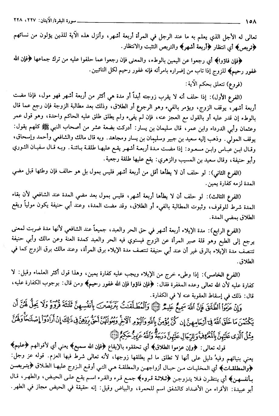 وَإِنْ عَزَمُوا الطَّلاقَ فَإِنَّ اللَّهَ سَمِيعٌ عَلِيمٌ (227) وَالْمُطَلَّقاتُ يَتَرَبَّصْنَ بِأَنْفُسِهِنَّ ثَلاثَةَ قُرُوءٍ وَلا يَحِلُّ لَهُنَّ أَنْ يَكْتُمْنَ ما خَلَقَ اللَّهُ فِي أَرْحامِهِنَّ إِنْ كُنَّ يُؤْمِنَّ بِاللَّهِ وَالْيَوْمِ الْآخِرِ وَبُعُولَتُهُنَّ أَحَقُّ بِرَدِّهِنَّ فِي ذلِكَ إِنْ أَرادُوا إِصْلاحاً وَلَهُنَّ مِثْلُ الَّذِي عَلَيْهِنَّ بِالْمَعْرُوفِ وَلِلرِّجالِ عَلَيْهِنَّ دَرَجَةٌ وَاللَّهُ عَزِيزٌ حَكِيمٌ (228)