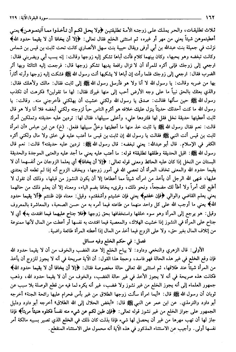 والذي بعثك بالحق نبيا ما على وجه الأرض أحب إلى منها غيرك فقال: لها ما تقولين؟ فكرهت أن تكذب رسول الله صلّى الله عليه وسلّم حين سألها فقالت: صدق يا رسول الله ولكني خشيت أن يهلكني فأخرجني منه. وقالت: يا رسول الله ما كنت أحدثك حديثا ينزل عليك خلافه هو أكرم الناس حبا لزوجته ولكني أبغضه فلا أنا ولا هو قال ثابت أعطيتها حديقة نخل فقل لها فلتردها علي، وأخلى سبيلها، فقال لها: تردين عليه حديقته وتملكين أمرك قالت: نعم فقال رسول الله صلّى الله عليه وسلّم يا ثابت خذ منها ما أعطيتها وخلّ سبيلها ففعل. (خ) عن ابن عباس «أن امرأة ثابت بن قيس أتت النبي صلّى الله عليه وسلّم فقالت يا رسول الله إن ثابت بن قيس ما أعتب عليه في خلق ولا مال ولكني أكره الكفر في الإسلام. قال أبو عبد الله: يعني تبغضه: قال رسول الله صلّى الله عليه وسلّم: تردين عليه حديقته؟ قالت: نعم قال رسول الله صلّى الله عليه وسلّم: اقبل الحديقة وطلقها تطليقة» قوله: ما أعتب عليه يعني ما أجد عليه والعتبى الموجدة والحديقة البستان من النخل إذا كان عليه الحائط ومعنى قوله تعالى: إِلَّا أَنْ يَخافا أي يعلما الزوجان من أنفسهما أن لا يقيما حدود الله والمعنى تخاف المرأة أن تعصي الله في أمور زوجها، ويخاف الزوج أنه إذا لم تطعه أن يعتدي عليها، فنهى الله الرجل أن يأخذ من امرأته شيئا مما أعطاها إلا أن يكون النشوز من قبلها، وذلك أن تقول لا أطيع لك أمرا ولا أطأ لك مضجعا، ونحو ذلك، وقرئ يخافا بضم الياء، ومعناه إلا أن يعلم ذلك من حالهما يعني يعلم القاضي والوالي فَإِنْ خِفْتُمْ يعني فإن خشيتم وأشفقتم، وقيل: معناه فإن ظننتم أَلَّا يُقِيما حُدُودَ اللَّهِ يعني ما أوجب الله على كل واحد منهما من طاعته فيما أمره به من حسن الصحبة، والمعاشرة بالمعروف وقيل: هو يرجع إلى المرأة وهو سوء خلقها واستخفافها بحق زوجها فَلا جُناحَ عَلَيْهِما فِيمَا افْتَدَتْ بِهِ أي لا جناح على المرأة في النشوز إذا خشيت الهلاك، والمعصية فيما افتدت به نفسها أو أعطت من المال لأنها ممنوعة من إتلاف المال بغير حق، ولا على الزوج فيما أخذ من المال إذا أعطته المرأة طائعة راضية.