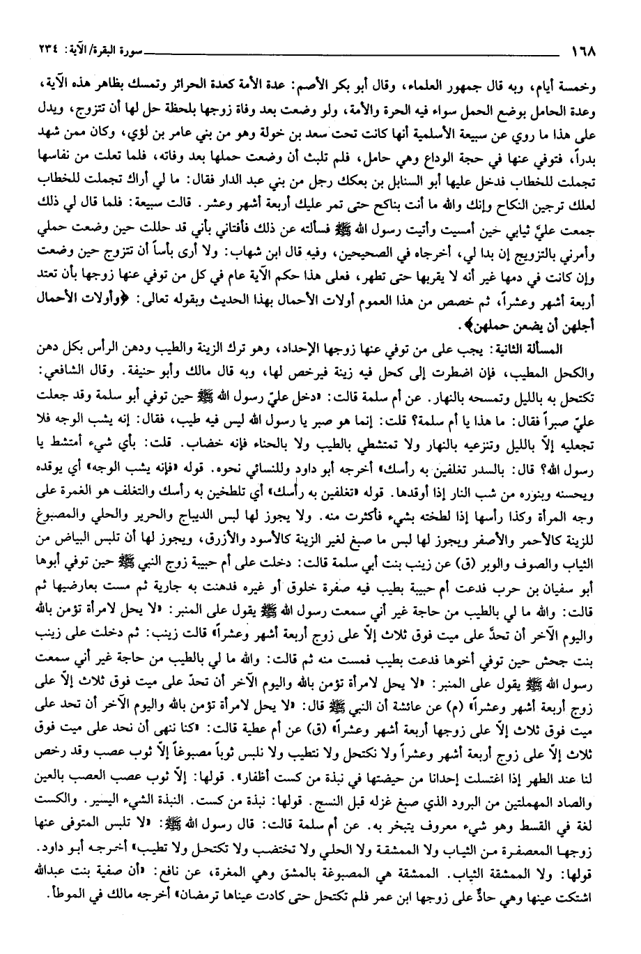وخمسة أيام، وبه قال جمهور العلماء، وقال أبو بكر الأصم: عدة الأمة كعدة الحرائر وتمسك بظاهر هذه الآية، وعدة الحامل بوضع الحمل سواء فيه الحرة والأمة، ولو وضعت بعد وفاة زوجها بلحظة حل لها أن تتزوج، ويدل على هذا ما روي عن سبيعة الأسلمية أنها كانت تحت سعد بن خولة وهو من بني عامر بن لؤي، وكان ممن شهد بدرا، فتوفي عنها في حجة الوداع وهي حامل، فلم تلبث أن وضعت حملها بعد وفاته، فلما تعلت من نفاسها تجملت للخطاب فدخل عليها أبو السنابل بن بعكك رجل من بني عبد الدار فقال: ما لي أراك تجملت للخطاب لعلك ترجين النكاح وإنك والله ما أنت بناكح حتى تمر عليك أربعة أشهر وعشر. قالت سبيعة: فلما قال لي ذلك جمعت عليّ ثيابي حين أمسيت وأتيت رسول الله صلّى الله عليه وسلّم فسألته عن ذلك فأفتاني بأني قد حللت حين وضعت حملي وأمرني بالتزويج إن بدا لي، أخرجاه في الصحيحين، وفيه قال ابن شهاب: ولا أرى بأسا أن تتزوج حين وضعت وإن كانت في دمها غير أنه لا يقربها حتى تطهر، فعلى هذا حكم الآية عام في كل من توفي عنها زوجها بأن تعتد أربعة أشهر وعشرا، ثم خصص من هذا العموم أولات الأحمال بهذا الحديث وبقوله تعالى: وَأُولاتُ الْأَحْمالِ أَجَلُهُنَّ أَنْ يَضَعْنَ حَمْلَهُنَّ.