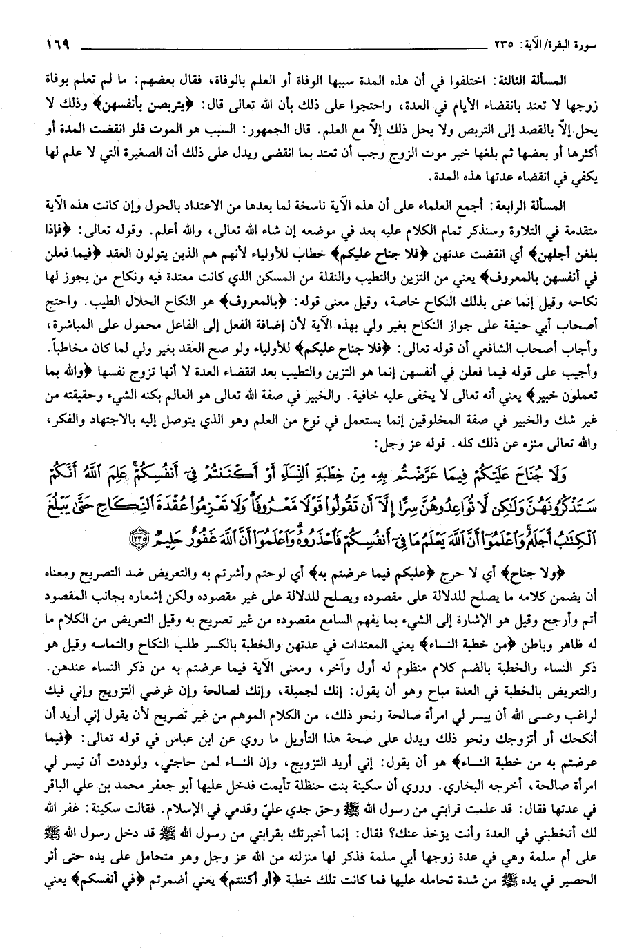 وَلا جُناحَ عَلَيْكُمْ فِيما عَرَّضْتُمْ بِهِ مِنْ خِطْبَةِ النِّساءِ أَوْ أَكْنَنْتُمْ فِي أَنْفُسِكُمْ عَلِمَ اللَّهُ أَنَّكُمْ سَتَذْكُرُونَهُنَّ وَلكِنْ لا تُواعِدُوهُنَّ سِرًّا إِلاَّ أَنْ تَقُولُوا قَوْلاً مَعْرُوفاً وَلا تَعْزِمُوا عُقْدَةَ النِّكاحِ حَتَّى يَبْلُغَ الْكِتابُ أَجَلَهُ وَاعْلَمُوا أَنَّ اللَّهَ يَعْلَمُ ما فِي أَنْفُسِكُمْ فَاحْذَرُوهُ وَاعْلَمُوا أَنَّ اللَّهَ غَفُورٌ حَلِيمٌ (235)