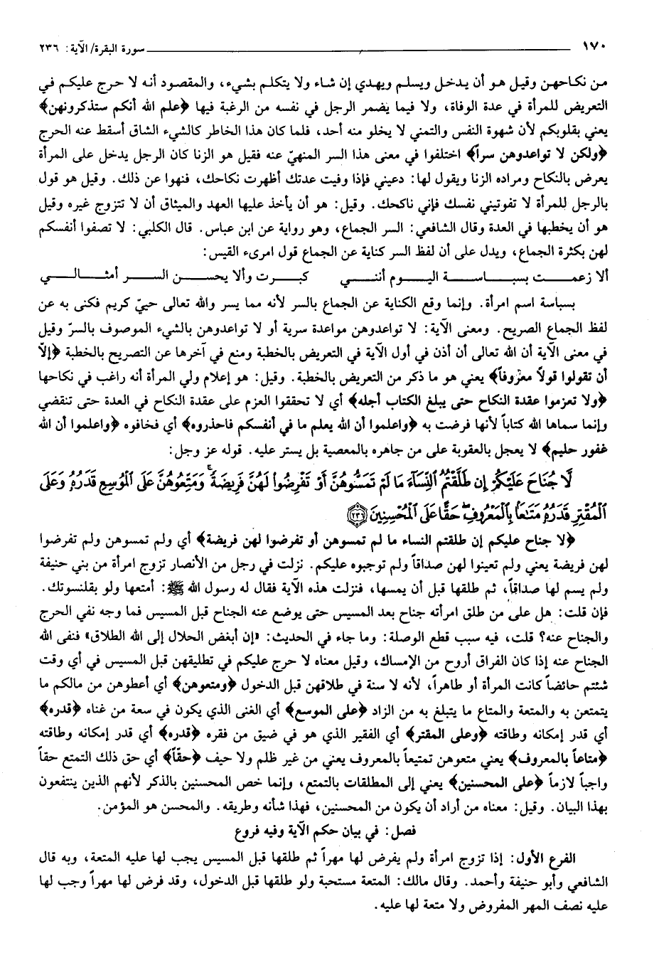 لا جُناحَ عَلَيْكُمْ إِنْ طَلَّقْتُمُ النِّساءَ ما لَمْ تَمَسُّوهُنَّ أَوْ تَفْرِضُوا لَهُنَّ فَرِيضَةً وَمَتِّعُوهُنَّ عَلَى الْمُوسِعِ قَدَرُهُ وَعَلَى الْمُقْتِرِ قَدَرُهُ مَتاعاً بِالْمَعْرُوفِ حَقًّا عَلَى الْمُحْسِنِينَ (236)
