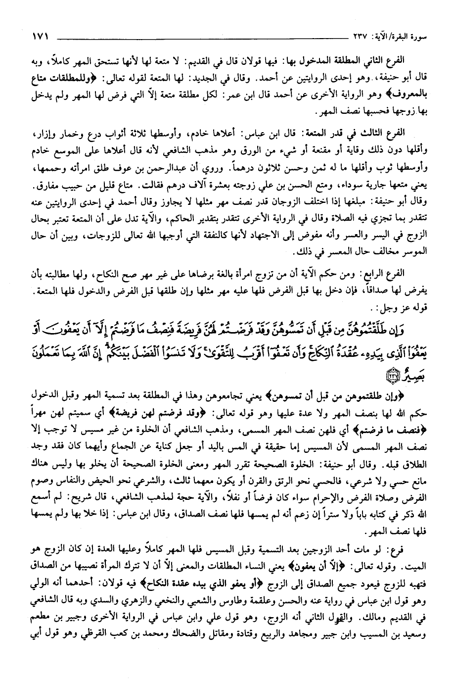 وَإِنْ طَلَّقْتُمُوهُنَّ مِنْ قَبْلِ أَنْ تَمَسُّوهُنَّ وَقَدْ فَرَضْتُمْ لَهُنَّ فَرِيضَةً فَنِصْفُ ما فَرَضْتُمْ إِلاَّ أَنْ يَعْفُونَ أَوْ يَعْفُوَا الَّذِي بِيَدِهِ عُقْدَةُ النِّكاحِ وَأَنْ تَعْفُوا أَقْرَبُ لِلتَّقْوى وَلا تَنْسَوُا الْفَضْلَ بَيْنَكُمْ إِنَّ اللَّهَ بِما تَعْمَلُونَ بَصِيرٌ (237)