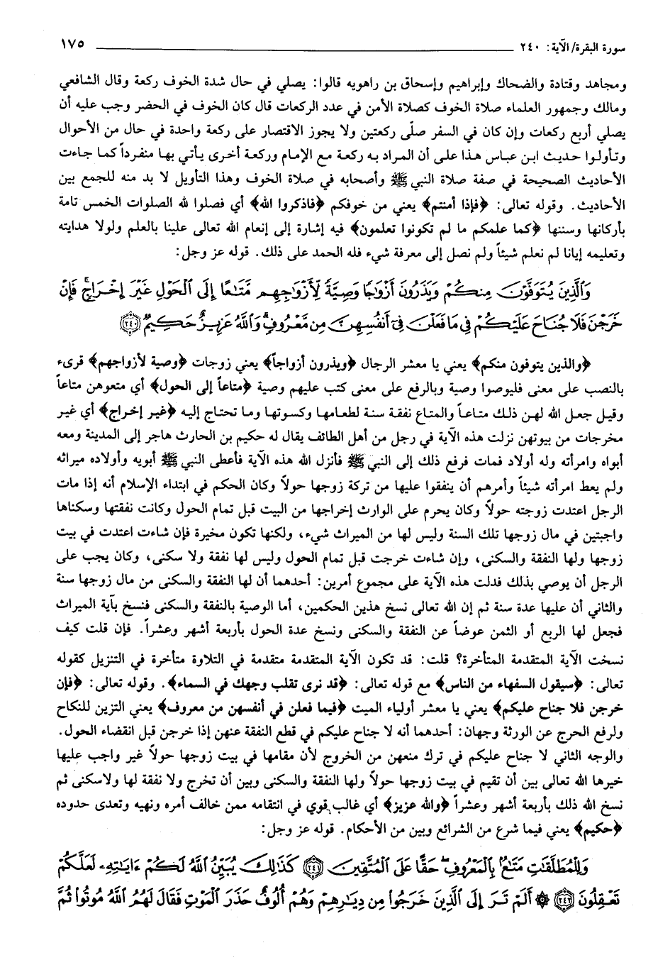 وَالَّذِينَ يُتَوَفَّوْنَ مِنْكُمْ وَيَذَرُونَ أَزْواجاً وَصِيَّةً لِأَزْواجِهِمْ مَتاعاً إِلَى الْحَوْلِ غَيْرَ إِخْراجٍ فَإِنْ خَرَجْنَ فَلا جُناحَ عَلَيْكُمْ فِي ما فَعَلْنَ فِي أَنْفُسِهِنَّ مِنْ مَعْرُوفٍ وَاللَّهُ عَزِيزٌ حَكِيمٌ (240)