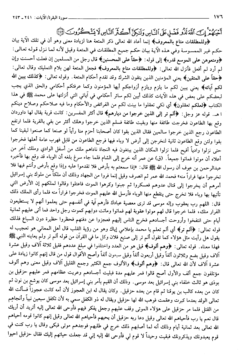 وَلِلْمُطَلَّقاتِ مَتاعٌ بِالْمَعْرُوفِ حَقًّا عَلَى الْمُتَّقِينَ (241) كَذلِكَ يُبَيِّنُ اللَّهُ لَكُمْ آياتِهِ لَعَلَّكُمْ تَعْقِلُونَ (242) أَلَمْ تَرَ إِلَى الَّذِينَ خَرَجُوا مِنْ دِيارِهِمْ وَهُمْ أُلُوفٌ حَذَرَ الْمَوْتِ فَقالَ لَهُمُ اللَّهُ مُوتُوا ثُمَّ أَحْياهُمْ إِنَّ اللَّهَ لَذُو فَضْلٍ عَلَى النَّاسِ وَلكِنَّ أَكْثَرَ النَّاسِ لا يَشْكُرُونَ (243)