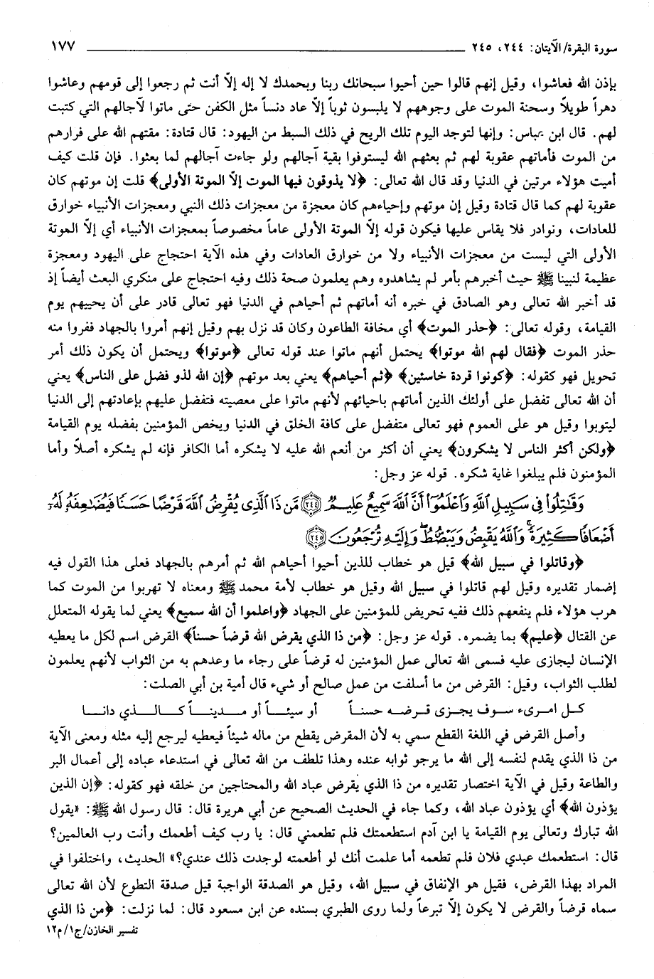 وَقاتِلُوا فِي سَبِيلِ اللَّهِ قيل هو خطاب للذين أحيوا أحياهم الله ثم أمرهم بالجهاد فعلى هذا القول فيه إضمار تقديره وقيل لهم قاتلوا في سبيل الله وقيل هو خطاب لأمة محمد صلّى الله عليه وسلّم ومعناه لا تهربوا من الموت كما هرب هؤلاء فلم ينفعهم ذلك ففيه تحريض للمؤمنين على الجهاد وَاعْلَمُوا أَنَّ اللَّهَ سَمِيعٌ يعني لما يقوله المتعلل عن القتال عَلِيمٌ بما يضمره. قوله عز وجل: مَنْ ذَا الَّذِي يُقْرِضُ اللَّهَ قَرْضاً حَسَناً القرض اسم لكل ما يعطيه الإنسان ليجازى عليه فسمى الله تعالى عمل المؤمنين له قرضا على رجاء ما وعدهم به من الثواب لأنهم يعلمون لطلب الثواب، وقيل: القرض من ما أسلفت من عمل صالح أو شيء قال أمية بن أبي الصلت: