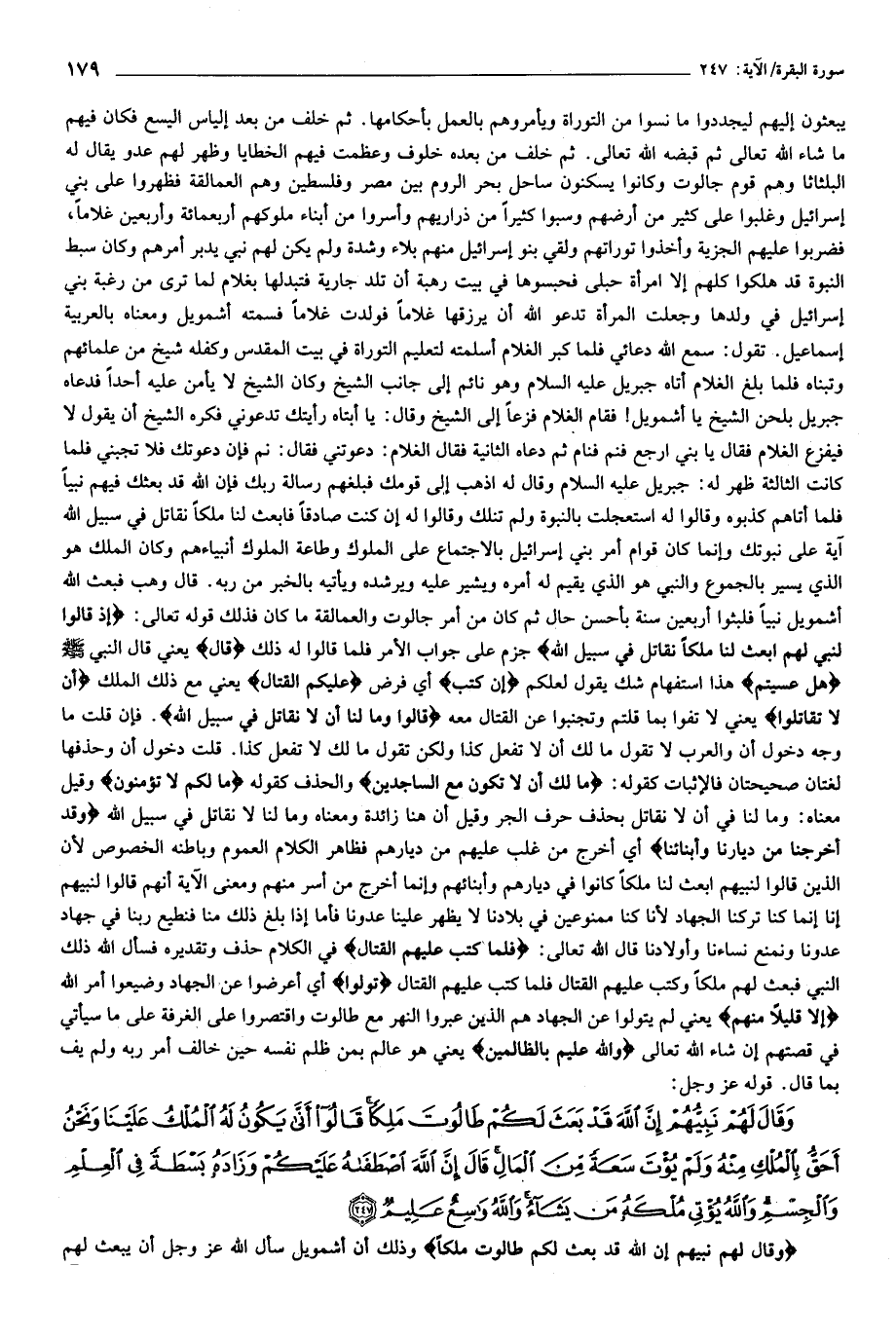 يبعثون إليهم ليجددوا ما نسوا من التوراة ويأمروهم بالعمل بأحكامها. ثم خلف من بعد إلياس اليسع فكان فيهم ما شاء الله تعالى ثم قبضه الله تعالى. ثم خلف من بعده خلوف وعظمت فيهم الخطايا وظهر لهم عدو يقال له البلثاثا وهم قوم جالوت وكانوا يسكنون ساحل بحر الروم بين مصر وفلسطين وهم العمالقة فظهروا على بني إسرائيل وغلبوا على كثير من أرضهم وسبوا كثيرا من ذراريهم وأسروا من أبناء ملوكهم أربعمائة وأربعين غلاما، فضربوا عليهم الجزية وأخذوا توراتهم ولقي بنو إسرائيل منهم بلاء وشدة ولم يكن لهم نبي يدبر أمرهم وكان سبط النبوة قد هلكوا كلهم إلا امرأة حبلى فحبسوها في بيت رهبة أن تلد جارية فتبدلها بغلام لما ترى من رغبة بني إسرائيل في ولدها وجعلت المرأة تدعو الله أن يرزقها غلاما فولدت غلاما فسمته أشمويل ومعناه بالعربية إسماعيل. تقول: سمع الله دعائي فلما كبر الغلام أسلمته لتعليم التوراة في بيت المقدس وكفله شيخ من علمائهم وتبناه فلما بلغ الغلام أتاه جبريل عليه السلام وهو نائم إلى جانب الشيخ وكان الشيخ لا يأمن عليه أحدا فدعاه جبريل بلحن الشيخ يا أشمويل! فقام الغلام فزعا إلى الشيخ وقال: يا أبتاه رأيتك تدعوني فكره الشيخ أن يقول لا فيفزع الغلام فقال يا بني ارجع فنم فنام ثم دعاه الثانية فقال الغلام: دعوتني فقال: نم فإن دعوتك فلا تجبني فلما كانت الثالثة ظهر له: جبريل عليه السلام وقال له اذهب إلى قومك فبلغهم رسالة ربك فإن الله قد بعثك فيهم نبيا فلما أتاهم كذبوه وقالوا له استعجلت بالنبوة ولم تنلك وقالوا له إن كنت صادقا فابعث لنا ملكا نقاتل في سبيل الله آية على نبوتك وإنما كان قوام أمر بني إسرائيل بالاجتماع على الملوك وطاعة الملوك أنبياءهم وكان الملك هو الذي يسير بالجموع والنبي هو الذي يقيم له أمره ويشير عليه ويرشده ويأتيه بالخبر من ربه. قال وهب فبعث الله أشمويل نبيا فلبثوا أربعين سنة بأحسن حال ثم كان من أمر جالوت والعمالقة ما كان فذلك قوله تعالى: إِذْ قالُوا لِنَبِيٍّ لَهُمُ ابْعَثْ لَنا مَلِكاً نُقاتِلْ فِي سَبِيلِ اللَّهِ جزم على جواب الأمر فلما قالوا له ذلك قالَ يعني قال النبي صلّى الله عليه وسلّم هَلْ عَسَيْتُمْ هذا استفهام شك يقول لعلكم إِنْ كُتِبَ أي فرض عَلَيْكُمُ الْقِتالُ يعني مع ذلك الملك أَلَّا تُقاتِلُوا يعني لا تفوا بما قلتم وتجنبوا عن القتال معه قالُوا وَما لَنا أَلَّا نُقاتِلَ فِي سَبِيلِ اللَّهِ. فإن قلت ما وجه دخول أن والعرب لا تقول ما لك أن لا تفعل كذا ولكن تقول ما لك لا تفعل كذا. قلت دخول أن وحذفها لغتان صحيحتان فالإثبات كقوله: ما لَكَ أَلَّا تَكُونَ مَعَ السَّاجِدِينَ والحذف كقوله ما لَكُمْ لا تُؤْمِنُونَ وقيل معناه: وما لنا في أن لا نقاتل بحذف حرف الجر وقيل أن هنا زائدة ومعناه وما لنا لا نقاتل في سبيل الله وَقَدْ أُخْرِجْنا مِنْ دِيارِنا وَأَبْنائِنا أي أخرج من غلب عليهم من ديارهم فظاهر الكلام العموم وباطنه الخصوص لأن الذين قالوا لنبيهم ابعث لنا ملكا كانوا في ديارهم وأبنائهم وإنما أخرج من أسر منهم ومعنى الآية أنهم قالوا لنبيهم إنا إنما كنا تركنا الجهاد لأنا كنا ممنوعين في بلادنا لا يظهر علينا عدونا فأما إذا بلغ ذلك منا فنطيع ربنا في جهاد عدونا ونمنع نساءنا وأولادنا قال الله تعالى: فَلَمَّا كُتِبَ عَلَيْهِمُ الْقِتالُ في الكلام حذف وتقديره فسأل الله ذلك النبي فبعث لهم ملكا وكتب عليهم القتال فلما كتب عليهم القتال تَوَلَّوْا أي أعرضوا عن الجهاد وضيعوا أمر الله إِلَّا قَلِيلًا مِنْهُمْ يعني لم يتولوا عن الجهاد هم الذين عبروا النهر مع طالوت واقتصروا على الغرفة على ما سيأتي في قصتهم إن شاء الله تعالى