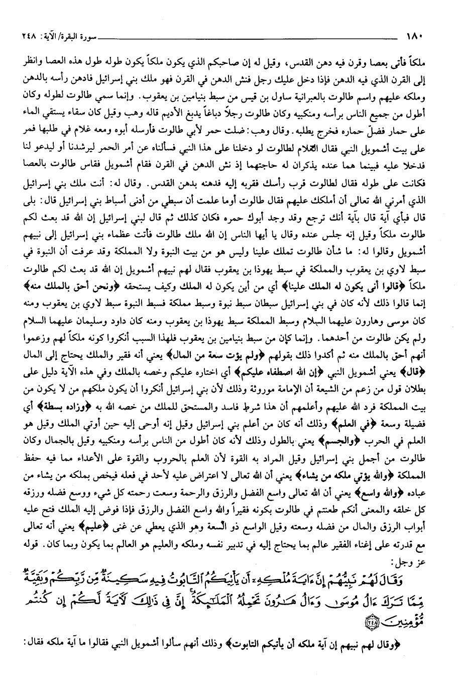 ملكا فأتى بعصا وقرن فيه دهن القدس، وقيل له إن صاحبكم الذي يكون ملكا يكون طوله طول هذه العصا وانظر إلى القرن الذي فيه الدهن فإذا دخل عليك رجل فنش الدهن في القرن فهو ملك بني إسرائيل فادهن رأسه بالدهن وملكه عليهم واسم طالوت بالعبرانية ساول بن قيس من سبط بنيامين بن يعقوب. وإنما سمي طالوت لطوله وكان أطول من جميع الناس برأسه ومنكبيه وكان طالوت رجلا دباغا يدبغ الأديم قاله وهب وقيل كان سقاء يستقي الماء على حمار فضلّ حماره فخرج يطلبه. وقال وهب: ضلت حمر لأبي طالوت فأرسله أبوه ومعه غلام في طلبها فمر على بيت أشمويل النبي فقال الغلام لطالوت لو دخلنا على هذا النبي فسألناه عن أمر الحمر ليرشدنا أو ليدعو لنا فدخلا عليه فبينما هما عنده يذكران له حاجتهما إذ نش الدهن في القرن فقام أشمويل فقاس طالوت بالعصا فكانت على طوله فقال لطالوت قرب رأسك فقربه إليه فدهنه بدهن القدس. وقال له: أنت ملك بني إسرائيل الذي أمرني الله تعالى أن أملكك عليهم فقال طالوت أو ما علمت أن سبطي من أدنى أسباط بني إسرائيل قال: بلى قال فبأي آية قال بآية أنك ترجع وقد وجد أبوك حمره فكان كذلك ثم قال لبني إسرائيل إن الله قد بعث لكم طالوت ملكا وقيل إنه جلس عنده وقال يا أيها الناس إن الله ملك طالوت فأتت عظماء بني إسرائيل إلى نبيهم أشمويل وقالوا له: ما شأن طالوت تملك علينا وليس هو من بيت النبوة ولا المملكة وقد عرفت أن النبوة في سبط لاوي بن يعقوب والمملكة في سبط يهوذا بن يعقوب فقال لهم نبيهم أشمويل إن الله قد بعث لكم طالوت ملكا قالُوا أَنَّى يَكُونُ لَهُ الْمُلْكُ عَلَيْنا أي من أين يكون له الملك وكيف يستحقه وَنَحْنُ أَحَقُّ بِالْمُلْكِ مِنْهُ إنما قالوا ذلك لأنه كان في بني إسرائيل سبطان سبط نبوة وسبط مملكة فسبط النبوة سبط لاوي بن يعقوب ومنه كان موسى وهارون عليهما السلام وسبط المملكة سبط يهوذا بن يعقوب ومنه كان داود وسليمان عليهما السلام ولم يكن طالوت من أحدهما. وإنما كان من سبط بنيامين بن يعقوب فلهذا السبب أنكروا كونه ملكا لهم وزعموا أنهم أحق بالملك منه ثم أكدوا ذلك بقولهم وَلَمْ يُؤْتَ سَعَةً مِنَ الْمالِ يعني أنه فقير والملك يحتاج إلى المال قالَ يعني أشمويل النبي إِنَّ اللَّهَ اصْطَفاهُ عَلَيْكُمْ أي اختاره عليكم وخصه بالملك وفي هذه الآية دليل على بطلان قول من زعم من الشيعة أن الإمامة موروثة وذلك لأن بني إسرائيل أنكروا أن يكون ملكهم من لا يكون من بيت المملكة فرد الله عليهم وأعلمهم أن هذا شرط فاسد والمستحق للملك من خصه الله به وَزادَهُ بَسْطَةً أي فضيلة وسعة فِي الْعِلْمِ وذلك أنه كان من أعلم بني إسرائيل وقيل إنه أوحى إليه حين أوتي الملك وقيل هو العلم في الحرب وَالْجِسْمِ يعني بالطول وذلك لأنه كان أطول من الناس برأسه ومنكبيه وقيل بالجمال وكان طالوت من أجمل بني إسرائيل وقيل المراد به القوة لأن العلم بالحروب والقوة على الأعداء مما فيه حفظ المملكة وَاللَّهُ يُؤْتِي مُلْكَهُ مَنْ يَشاءُ يعني أن الله تعالى لا اعتراض عليه لأحد في فعله فيخص بملكه من يشاء من عباده وَاللَّهُ واسِعٌ يعني أن الله تعالى واسع الفضل والرزق والرحمة وسعت رحمته كل شيء ووسع فضله ورزقه كل خلقه والمعنى أنكم طعنتم في طالوت بكونه فقيرا والله واسع الفضل والرزق فإذا فوض إليه الملك فتح عليه أبواب الرزق والمال من فضله وسعته وقيل الواسع ذو السعة وهو الذي يعطي عن غنى عَلِيمٌ يعني أنه تعالى مع قدرته على إغناء الفقير عالم بما يحتاج إليه في تدبير نفسه وملكه والعليم هو العالم بما يكون وبما كان. قوله عز وجل:
