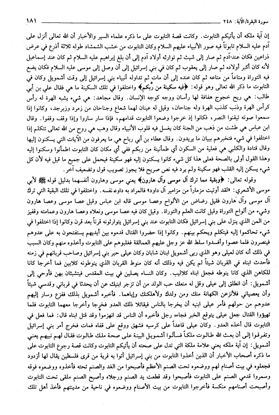 وقوله تعالى: وَبَقِيَّةٌ مِمَّا تَرَكَ آلُ مُوسى وَآلُ هارُونَ يعني موسى وهارون أنفسهما بدليل قوله صلّى الله عليه وسلّم لأبي موسى الأشعري: «لقد أوتيت مزمارا من مزامير آل داود» فالمراد به داود نفسه. واختلفوا في تلك البقية التي ترك آل موسى وآل هارون فقيل رضاض من الألواح وعصا موسى قاله ابن عباس وقيل عصا موسى وعصا هارون وشيء من ألواح التوراة وقيل كانت العلم والتوراة. وقيل كان فيه عصا موسى ونعلاه وعصا هارون وعمامته وقفيز من المن الذي ينزل على بني إسرائيل فكان التابوت عند بني إسرائيل يتوارثونه قرنا بعد قرن وكانوا إذا اختلفوا في شيء تحاكموا إليه فيتكلم ويحكم بينهم. وكانوا إذا حضروا القتال قدموه بين أيديهم يستفتحون به على عدوهم فينصرون فلما عصوا وأفسدوا سلط الله عز وجل عليهم العمالقة فغلبوهم على التابوت وأخذوه منهم وكان السبب في ذلك أنه كان لعيلى وهو الذي ربي أشمويل ابنان شابان وكان عيلى حبر بني إسرائيل وصاحب قربانهم في زمنه فأحدث ابناه في القربان شيئا لم يكن فيه وذلك أنه كان منوط القربان الذي ينوطونه كلابين فما أخرجا كانا للكاهن الذي كانا ينوطه فجعل ابناه كلاليب. وكان النساء يصلين في بيت المقدس فيتشبثان بهن فأوحي إلى أشمويل: أن انطلق إلى عيلى وقل له منعك حب الولد من أن تزجر ابنيك عن أن يحدثا في قرباني وقدسي شيئا وأن يعصياني فلأنزعن الكهانة منك ومن ولدك ولأهلكنك وإياهما. فأخبره أشمويل بذلك ففزع وسار إليهم عدوهم من حولهم فأمر عيلى ابنيه أن يخرجا بالناس فيقاتلا ذلك العدو فخرجا وأخرجا معهما التابوت فلما تهيؤوا القتال جعل عيلى يتوقع الخبر فجاءه رجل فأخبره أن الناس قد انهزموا وقد قتل ابناه قال: فما فعل في التابوت قال أخذه العدو. وكان عيلى قاعدا على كرسيه فشهق ووقع على قفاه فمات فخرج أمر بني إسرائيل وتفرقوا إلى أن بعث الله طالوت ملكا فسألوا أشمويل البينة على صحة ملك طالوت فقال لهم نبيهم يعني أشمويل: إن آية ملكه يعني علامة ملكة التي تدل على صحته أن يأتيكم التابوت وكانت قصة رجوع التابوت على ما ذكره أصحاب الأخبار أن الذين أخذوا التابوت من بني إسرائيل أتوا به قرية من قرى فلسطين يقال لها أزدود فجعلوه في بيت أصنام لهم ووضعوه تحت الصنم الأعظم فأصبحوا من الغد والصنم تحته فأخذوه ووضعوه فوقه وسمروا قدمي الصنم على التابوت فأصبحوا وقد قطعت يد الصنم ورجلاه وأصبح الصنم ملقى تحت التابوت وأصبحت أصنامهم منكسة فأخرجوا التابوت من بيت الأصنام ووضعوه في ناحية من مدينتهم فأخذ أهل تلك