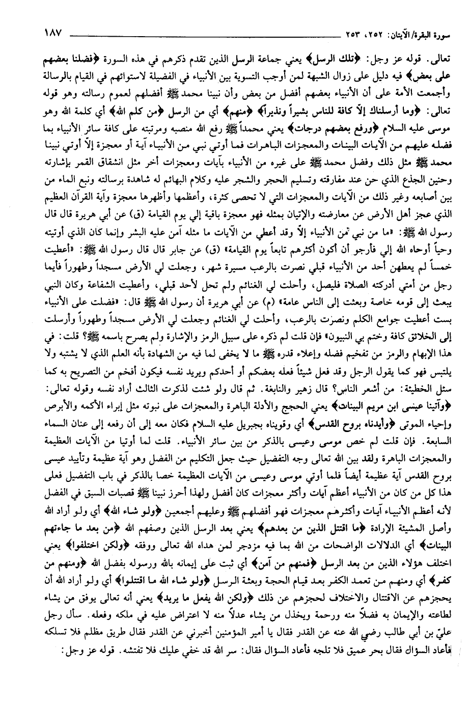 تعالى. قوله عز وجل: تِلْكَ الرُّسُلُ يعني جماعة الرسل الذين تقدم ذكرهم في هذه السورة فَضَّلْنا بَعْضَهُمْ عَلى بَعْضٍ فيه دليل على زوال الشبهة لمن أوجب التسوية بين الأنبياء في الفضيلة لاستوائهم في القيام بالرسالة وأجمعت الأمة على أن الأنبياء بعضهم أفضل من بعض وأن نبينا محمد صلّى الله عليه وسلّم أفضلهم لعموم رسالته وهو قوله تعالى: وَما أَرْسَلْناكَ إِلَّا كَافَّةً لِلنَّاسِ بَشِيراً وَنَذِيراً مِنْهُمْ أي من الرسل مَنْ كَلَّمَ اللَّهُ أي كلمة الله وهو موسى عليه السلام وَرَفَعَ بَعْضَهُمْ دَرَجاتٍ يعني محمدا صلّى الله عليه وسلّم رفع الله منصبه ومرتبته على كافة سائر الأنبياء بما فضله عليهم من الآيات البينات والمعجزات الباهرات فما أوتي نبي من الأنبياء آية أو معجزة إلّا أوتي نبينا محمد صلّى الله عليه وسلّم مثل ذلك وفضل محمد صلّى الله عليه وسلّم على غيره من الأنبياء بآيات ومعجزات أخر مثل انشقاق القمر بإشارته وحنين الجذع الذي حن عند مفارقته وتسليم الحجر والشجر عليه وكلام البهائم له شاهدة برسالته ونبع الماء من بين أصابعه وغير ذلك من الآيات والمعجزات التي لا تحصى كثرة، وأعظمها وأظهرها معجزة وآية القرآن العظيم الذي عجز أهل الأرض عن معارضته والإتيان بمثله فهو معجزة باقية إلي يوم القيامة (ق) عن أبي هريرة قال قال رسول الله صلّى الله عليه وسلّم: «ما من نبي من الأنبياء إلّا وقد أعطي من الآيات ما مثله آمن عليه البشر وإنما كان الذي أوتيته وحيا أوحاه الله إلي فأرجو أن أكون أكثرهم تابعا يوم القيامة» (ق) عن جابر قال قال رسول الله صلّى الله عليه وسلّم: «أعطيت خمسا لم يعطهن أحد من الأنبياء قبلي نصرت بالرعب مسيرة شهر، وجعلت لي الأرض مسجدا وطهورا فأيما رجل من أمتي أدركته الصلاة فليصل، وأحلت لي الغنائم ولم تحل لأحد قبلي، وأعطيت الشفاعة وكان النبي يبعث إلى قومه خاصة وبعثت إلى الناس عامة» (م) عن أبي هريرة أن رسول الله صلّى الله عليه وسلّم قال: «فضلت على الأنبياء بست أعطيت جوامع الكلم ونصرت بالرعب، وأحلت لي الغنائم وجعلت لي الأرض مسجدا وطهورا وأرسلت إلى الخلائق كافة وختم بي النبيون» فإن قلت لم ذكره على سبيل الرمز والإشارة ولم يصرح باسمه صلّى الله عليه وسلّم؟ قلت: في هذا الإبهام والرمز من تفخيم فضله وإعلاء قدره صلّى الله عليه وسلّم ما لا يخفى لما فيه من الشهادة بأنه العلم الذي لا يشتبه ولا يلتبس فهو كما يقول الرجل وقد فعل شيئا فعله بعضكم أو أحدكم ويريد نفسه فيكون أفخم من التصريح به كما سئل الخطيئة: من أشعر الناس؟ قال زهير والنابغة. ثم قال ولو شئت لذكرت الثالث أراد نفسه وقوله تعالى: