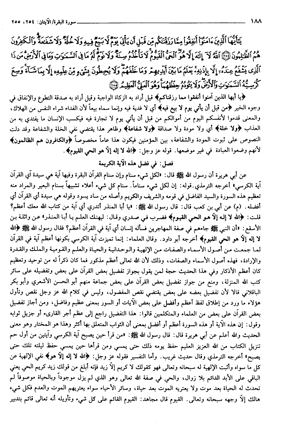 يا أَيُّهَا الَّذِينَ آمَنُوا أَنْفِقُوا مِمَّا رَزَقْناكُمْ مِنْ قَبْلِ أَنْ يَأْتِيَ يَوْمٌ لا بَيْعٌ فِيهِ وَلا خُلَّةٌ وَلا شَفاعَةٌ وَالْكافِرُونَ هُمُ الظَّالِمُونَ (254) اللَّهُ لا إِلهَ إِلاَّ هُوَ الْحَيُّ الْقَيُّومُ لا تَأْخُذُهُ سِنَةٌ وَلا نَوْمٌ لَهُ ما فِي السَّماواتِ وَما فِي الْأَرْضِ مَنْ ذَا الَّذِي يَشْفَعُ عِنْدَهُ إِلاَّ بِإِذْنِهِ يَعْلَمُ ما بَيْنَ أَيْدِيهِمْ وَما خَلْفَهُمْ وَلا يُحِيطُونَ بِشَيْءٍ مِنْ عِلْمِهِ إِلاَّ بِما شاءَ وَسِعَ كُرْسِيُّهُ السَّماواتِ وَالْأَرْضَ وَلا يَؤُدُهُ حِفْظُهُما وَهُوَ الْعَلِيُّ الْعَظِيمُ (255)