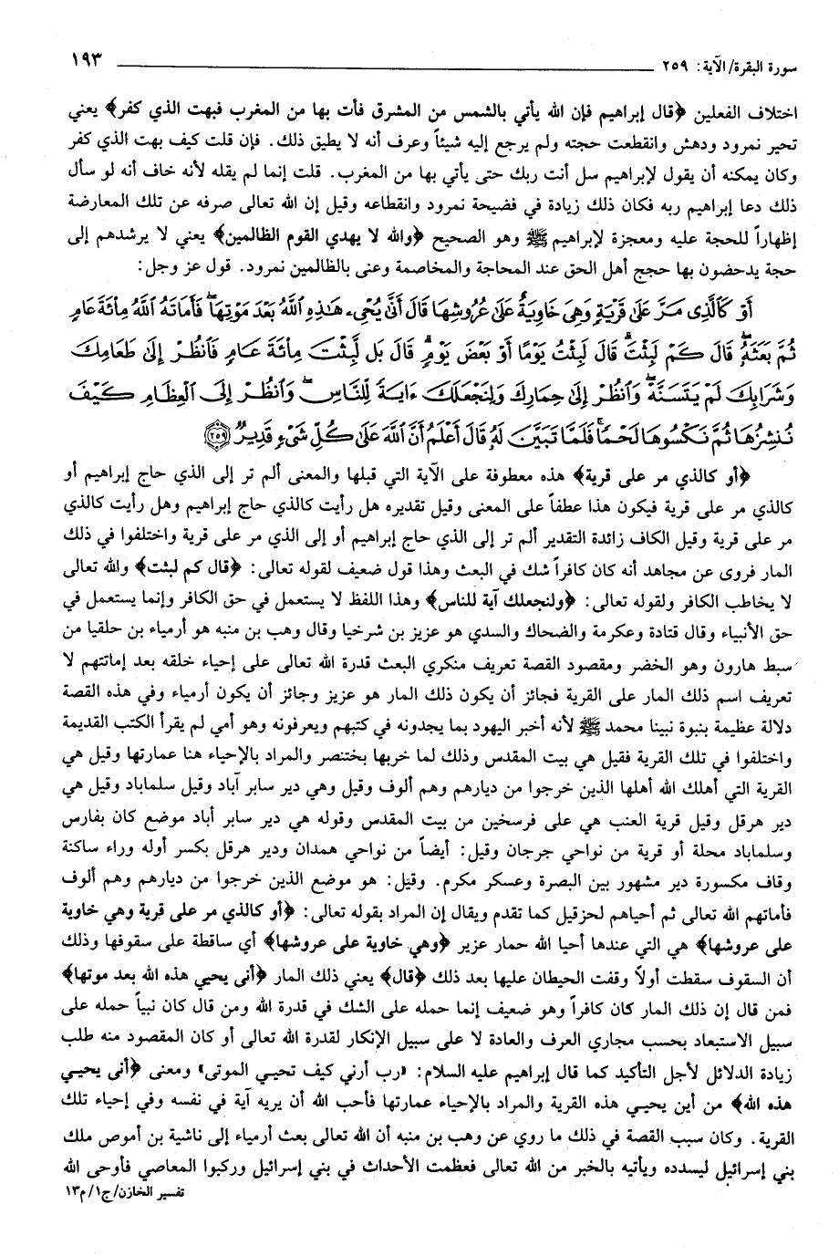 أَوْ كَالَّذِي مَرَّ عَلى قَرْيَةٍ وَهِيَ خاوِيَةٌ عَلى عُرُوشِها قالَ أَنَّى يُحْيِي هذِهِ اللَّهُ بَعْدَ مَوْتِها فَأَماتَهُ اللَّهُ مِائَةَ عامٍ ثُمَّ بَعَثَهُ قالَ كَمْ لَبِثْتَ قالَ لَبِثْتُ يَوْماً أَوْ بَعْضَ يَوْمٍ قالَ بَلْ لَبِثْتَ مِائَةَ عامٍ فَانْظُرْ إِلى طَعامِكَ وَشَرابِكَ لَمْ يَتَسَنَّهْ وَانْظُرْ إِلى حِمارِكَ وَلِنَجْعَلَكَ آيَةً لِلنَّاسِ وَانْظُرْ إِلَى الْعِظامِ كَيْفَ نُنْشِزُها ثُمَّ نَكْسُوها لَحْماً فَلَمَّا تَبَيَّنَ لَهُ قالَ أَعْلَمُ أَنَّ اللَّهَ عَلى كُلِّ شَيْءٍ قَدِيرٌ (259)