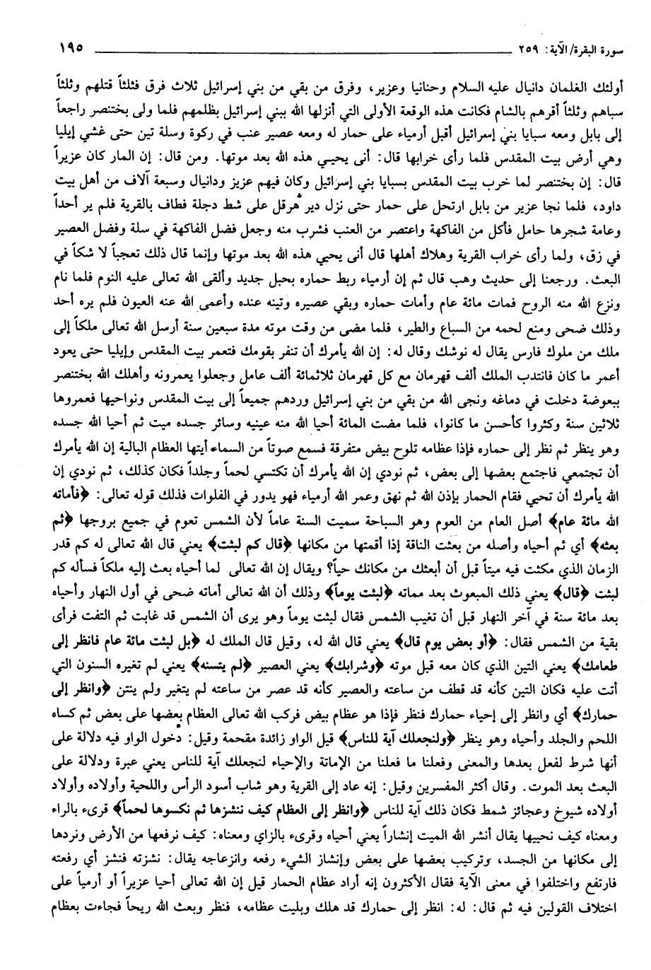 أولئك الغلمان دانيال عليه السلام وحنانيا وعزير، وفرق من بقي من بني إسرائيل ثلاث فرق فثلثا قتلهم وثلثا سباهم وثلثا أقرهم بالشام فكانت هذه الوقعة الأولى التي أنزلها الله ببني إسرائيل بظلمهم فلما ولى بختنصر راجعا إلى بابل ومعه سبايا بني إسرائيل أقبل أرمياء على حمار له ومعه عصير عنب في ركوة وسلة تين حتى غشي إيليا وهي أرض بيت المقدس فلما رأى خرابها قال: أنى يحيي هذه الله بعد موتها. ومن قال: إن المار كان عزيرا قال: إن بختنصر لما خرب بيت المقدس بسبايا بني إسرائيل وكان فيهم عزيز ودانيال وسبعة آلاف من أهل بيت داود، فلما نجا عزير من بابل ارتحل على حمار حتى نزل دير هرقل على شط دجلة فطاف بالقرية فلم ير أحدا وعامة شجرها حامل فأكل من الفاكهة واعتصر من العنب فشرب منه وجعل فضل الفاكهة