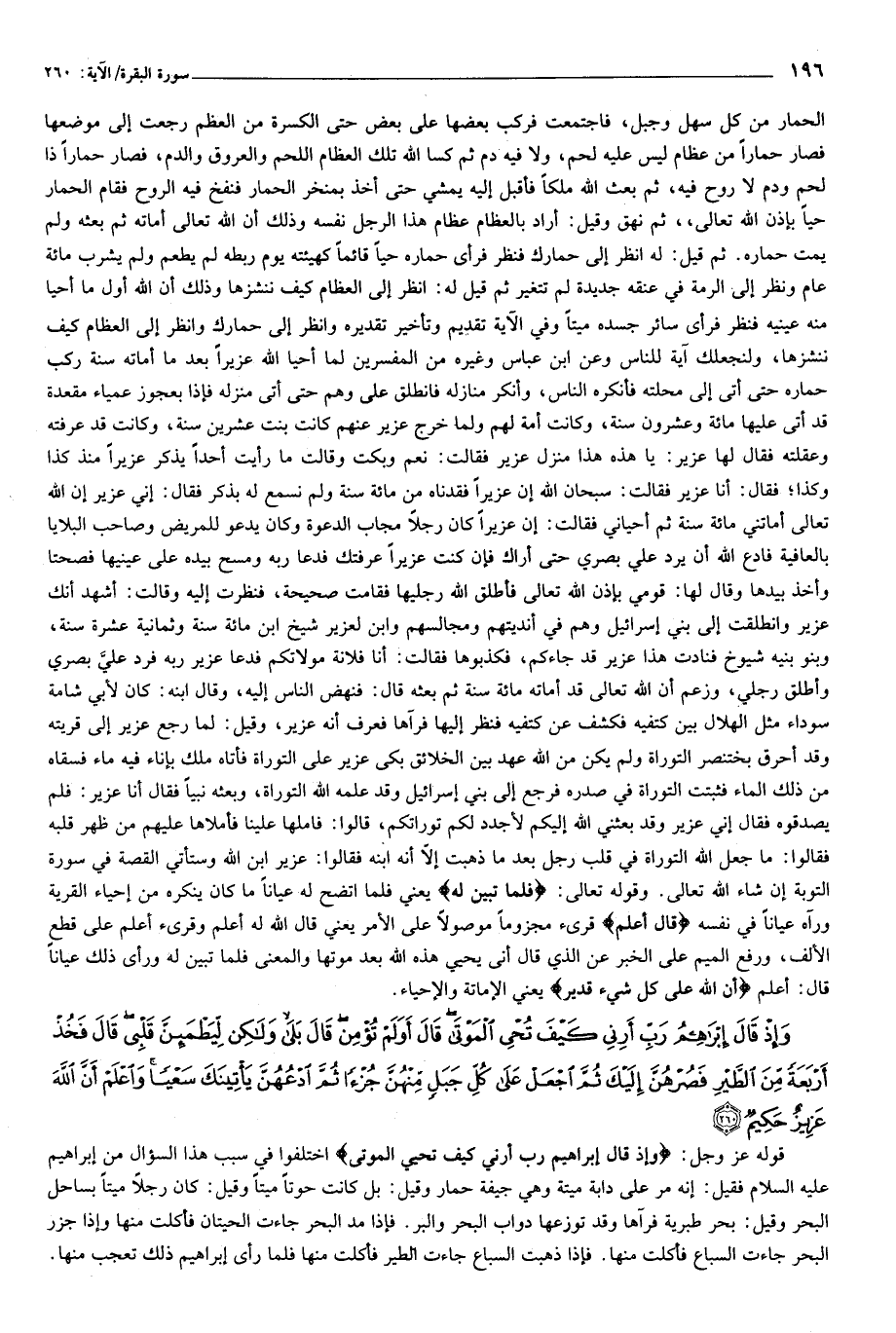 وَإِذْ قالَ إِبْراهِيمُ رَبِّ أَرِنِي كَيْفَ تُحْيِ الْمَوْتى قالَ أَوَلَمْ تُؤْمِنْ قالَ بَلى وَلكِنْ لِيَطْمَئِنَّ قَلْبِي قالَ فَخُذْ أَرْبَعَةً مِنَ الطَّيْرِ فَصُرْهُنَّ إِلَيْكَ ثُمَّ اجْعَلْ عَلى كُلِّ جَبَلٍ مِنْهُنَّ جُزْءاً ثُمَّ ادْعُهُنَّ يَأْتِينَكَ سَعْياً وَاعْلَمْ أَنَّ اللَّهَ عَزِيزٌ حَكِيمٌ (260)