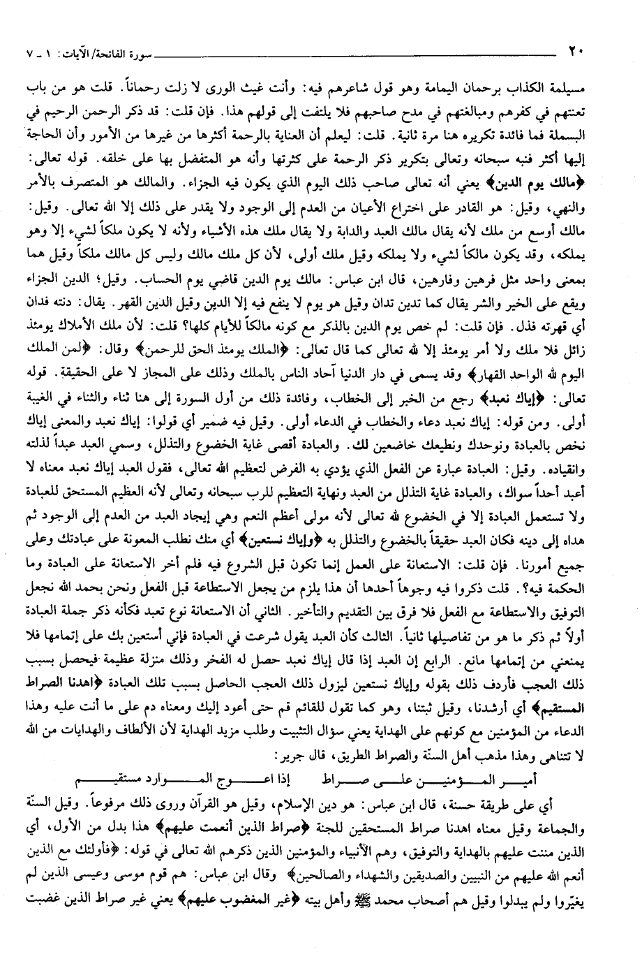 مالك أوسع من ملك لأنه يقال مالك العبد والدابة ولا يقال ملك هذه الأشياء ولأنه لا يكون ملكا لشيء إلا وهو يملكه، وقد يكون مالكا لشيء ولا يملكه وقيل ملك أولى، لأن كل ملك مالك وليس كل مالك ملكا وقيل هما بمعنى واحد مثل فرهين وفارهين، قال ابن عباس: مالك يوم الدين قاضي يوم الحساب. وقيل الدين الجزاء ويقع على الخير والشر يقال كما تدين تدان وقيل هو يوم لا ينفع فيه إلا الدين وقيل الدين القهر. يقال: دنته فدان أي قهرته فذل. فإن قلت: لم خص يوم الدين بالذكر مع كونه مالكا للأيام كلها؟ قلت: لأن ملك الأملاك يومئذ زائل فلا ملك ولا أمر يومئذ إلا لله تعالى كما قال تعالى: الْمُلْكُ يَوْمَئِذٍ الْحَقُّ لِلرَّحْمنِ وقال: لِمَنِ الْمُلْكُ الْيَوْمَ لِلَّهِ الْواحِدِ الْقَهَّارِ وقد يسمى في دار الدنيا آحاد الناس بالملك وذلك على المجاز لا على الحقيقة. قوله تعالى: إِيَّاكَ نَعْبُدُ رجع من الخبر إلى الخطاب، وفائدة ذلك من أول السورة إلى هنا ثناء والثناء في الغيبة أولى. ومن قوله: إياك نعبد دعاء والخطاب في الدعاء أولى. وقيل فيه ضمير أي قولوا: إياك نعبد والمعنى إياك نخص بالعبادة ونوحدك ونطيعك خاضعين لك. والعبادة أقصى غاية الخضوع والتذلل، وسمي العبد عبدا لذلته وانقياده. وقيل: العبادة عبارة عن الفعل الذي يؤدي به الفرض لتعظيم الله تعالى، فقول العبد إياك نعبد معناه لا أعبد أحدا سواك، والعبادة غاية التذلل من العبد ونهاية التعظيم للرب سبحانه وتعالى لأنه العظيم المستحق للعبادة ولا تستعمل العبادة إلا في الخضوع لله تعالى لأنه مولى أعظم النعم وهي إيجاد العبد من العدم إلى الوجود ثم هداه إلى دينه فكان العبد حقيقا بالخضوع والتذلل به وَإِيَّاكَ نَسْتَعِينُ أي منك نطلب المعونة على عبادتك وعلى جميع أمورنا. فإن قلت: الاستعانة على العمل إنما تكون قبل الشروع فيه فلم أخر الاستعانة على العبادة وما الحكمة فيه؟. قلت ذكروا فيه وجوها أحدها أن هذا يلزم من يجعل الاستطاعة قبل الفعل ونحن بحمد الله نجعل التوفيق والاستطاعة مع الفعل فلا فرق بين التقديم والتأخير. الثاني أن الاستعانة نوع تعبد فكأنه ذكر جملة العبادة أولا ثم ذكر ما هو من تفاصيلها ثانيا. الثالث كأن العبد يقول شرعت في العبادة فإني أستعين بك على إتمامها فلا يمنعني من إتمامها مانع. الرابع إن العبد إذا قال إياك نعبد حصل له الفخر وذلك منزلة عظيمة فيحصل بسبب ذلك العجب فأردف ذلك بقوله وإياك نستعين ليزول ذلك العجب الحاصل بسبب تلك العبادة اهْدِنَا الصِّراطَ الْمُسْتَقِيمَ أي أرشدنا، وقيل ثبتنا، وهو كما تقول للقائم قم حتى أعود إليك ومعناه دم على ما أنت عليه وهذا الدعاء من المؤمنين مع كونهم على الهداية يعني سؤال التثبيت وطلب مزيد الهداية لأن الألطاف والهدايات من الله لا تتناهى وهذا مذهب أهل السنّة والصراط الطريق، قال جرير: