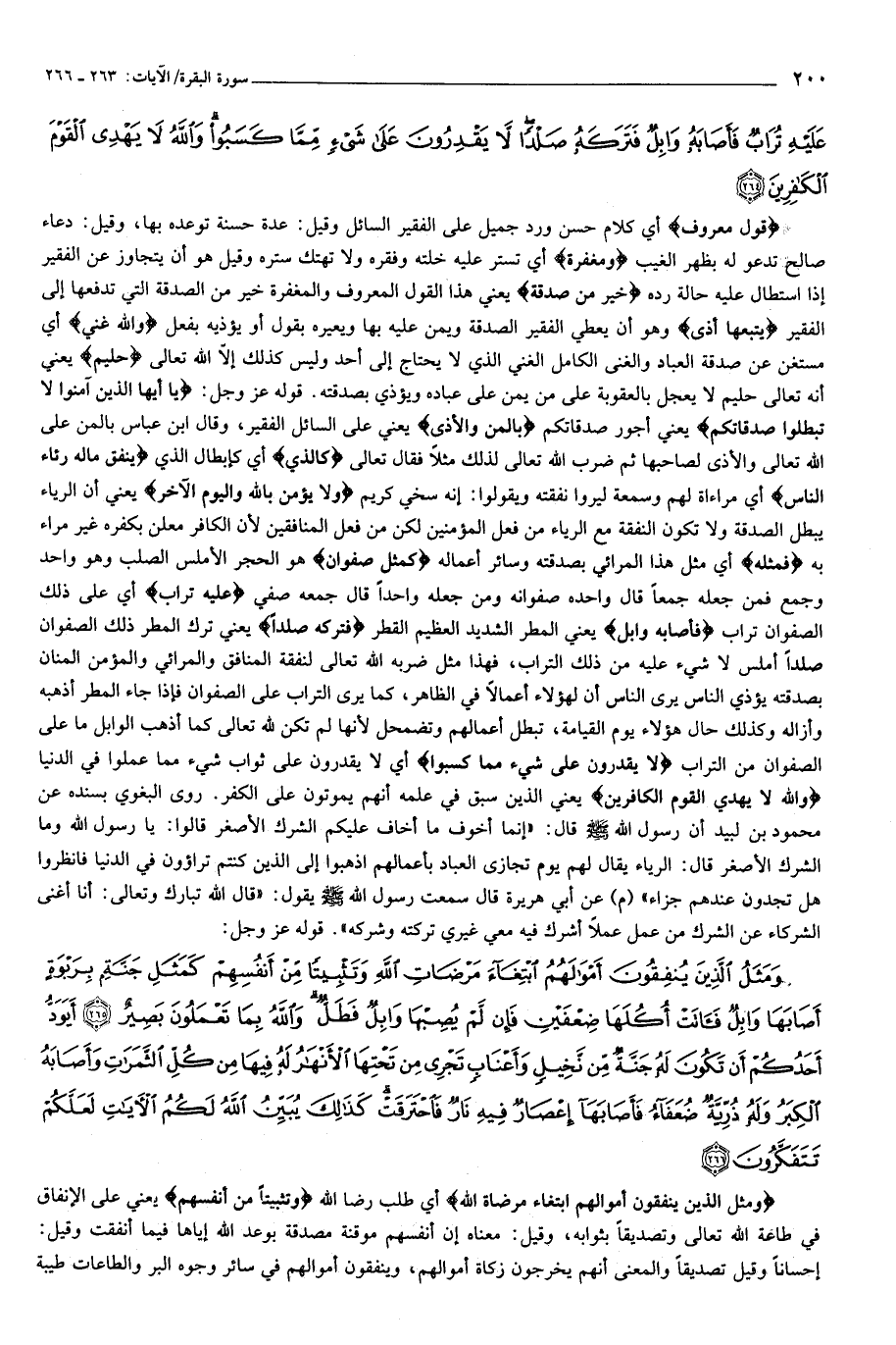 قَوْلٌ مَعْرُوفٌ وَمَغْفِرَةٌ خَيْرٌ مِنْ صَدَقَةٍ يَتْبَعُها أَذىً وَاللَّهُ غَنِيٌّ حَلِيمٌ (263) يا أَيُّهَا الَّذِينَ آمَنُوا لا تُبْطِلُوا صَدَقاتِكُمْ بِالْمَنِّ وَالْأَذى كَالَّذِي يُنْفِقُ مالَهُ رِئاءَ النَّاسِ وَلا يُؤْمِنُ بِاللَّهِ وَالْيَوْمِ الْآخِرِ فَمَثَلُهُ كَمَثَلِ صَفْوانٍ عَلَيْهِ تُرابٌ فَأَصابَهُ وابِلٌ فَتَرَكَهُ صَلْداً لا يَقْدِرُونَ عَلى شَيْءٍ مِمَّا كَسَبُوا وَاللَّهُ لا يَهْدِي الْقَوْمَ الْكافِرِينَ (264)