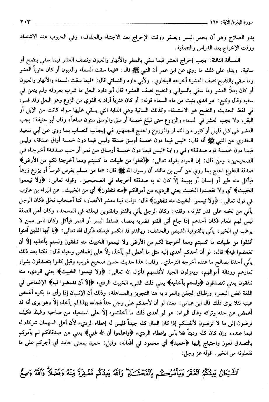 المسألة الثالثة: يجب إخراج العشر فيما سقي بالمطر والأنهار والعيون ونصف العشر فيما سقي بنضح أو سانية، ويدل على ذلك ما روي عن ابن عمر أن النبي صلّى الله عليه وسلّم قال: «فيما سقت السماء والعيون أو كان عثريا العشر وما سقي بالنضح نصف العشر» أخرجه البخاري. ولأبي داود والنسائي قال: «فيما سقت السماء والأنهار والعيون أو كان بعلا العشر وما سقي بالسواني والنضح نصف العشر» قال أبو داود البعل ما شرب بعروقه ولم يتعن في سقيه وقال وكيع: هو الذي ينبت من ماء السماء قوله: أو كان عثريا أراد به القوي من الزرع وهو البعل وقد فسره في لفظ الحديث والنضح هو الاستسقاء وكذلك السانية وهي الدابة التي يسقي عليها سواء كانت من الإبل أو البقر، ولا يجب العشر في السماء والزروع حتى تبلغ خمسة أوسق والوسق ستون صاعا، وقال أبو حنيفة: يجب العشر في كل قليل أو كثير من الثمار والزروع واحتج الجمهور في إيجاب النصاب بما روي عن أبي سعيد الخدري عن النبي صلّى الله عليه وسلّم أنه قال: «ليس فيما دون خمسة أوسق صدقة وليس فيما دون خمسة أواق صدقة، وليس فيما دون خمسة ذود صدقة» وفي رواية «ليس فيما دون خمسة أوساق من تمر أو حب صدقة» أخرجاه في الصحيحين، ومن قال: إن المراد بقوله تعالى: أَنْفِقُوا مِنْ طَيِّباتِ ما كَسَبْتُمْ وَمِمَّا أَخْرَجْنا لَكُمْ مِنَ الْأَرْضِ صدقة التطوع احتج بما روي عن أنس بن مالك أن رسول الله صلّى الله عليه وسلّم قال: «ما من مسلم يغرس غرسا أو يزرع زرعا فيأكل منه طير أو إنسان أو بهيمة إلّا كان له به صدقة» أخرجاه في الصحيحين. وقوله تعالى: وَلا تَيَمَّمُوا الْخَبِيثَ أي ولا تقصدوا الخبيث يعني الرديء من أموالكم مِنْهُ تُنْفِقُونَ أي من الخبيث. عن البراء بن عازب في قوله تعالى: وَلا تَيَمَّمُوا الْخَبِيثَ مِنْهُ تُنْفِقُونَ قال: نزلت فينا معشر الأنصار، كنا أصحاب نخل فكان الرجل يأتي من نخله على قدر كثرته، وقلته: وكان الرجل يأتي بالقنو والقنوين فيعلقه في المسجد، وكان أهل الصفة ليس لهم طعام فكان أحدهم إذا جاع أتى القنو فضربه بعصا، فسقط البسر أو التمر فيأكل وكان ناس ممن لا يرغب في الخير، يأتي بالقنوفية الشيص والحشف، وبالقنو قد انكسر فيعلقه فأنزل الله تعالى: يا أَيُّهَا الَّذِينَ آمَنُوا أَنْفِقُوا مِنْ طَيِّباتِ ما كَسَبْتُمْ وَمِمَّا أَخْرَجْنا لَكُمْ مِنَ الْأَرْضِ وَلا تَيَمَّمُوا الْخَبِيثَ مِنْهُ تُنْفِقُونَ وَلَسْتُمْ بِآخِذِيهِ إِلَّا أَنْ تُغْمِضُوا فِيهِ قال: لو أن أحدكم أهدي إليه مثل ما أعطى لم يأخذه إلّا على إغماض وحياء قال: فكنا بعد ذلك يأتي أحدنا بصالح ما عنده أخرجه الترمذي. وقال: هذا حديث حسن صحيح غريب وقيل كانوا يتصدقون بشرار ثمارهم ورذالة أموالهم، ويعزلون الجيد لأنفسهم فأنزل الله تعالى: وَلا تَيَمَّمُوا الْخَبِيثَ يعني الرديء منه تنفقون يعني تتصدقون وَلَسْتُمْ بِآخِذِيهِ يعني ذلك الشيء الخبيث الرديء إِلَّا أَنْ تُغْمِضُوا فِيهِ الإغماض في اللغة غض البصر، وإطباق الجفن والمراد به هنا التجويز والمساهلة، وذلك أن الإنسان إذا رأى ما يكره أغمض عينيه لئلا يرى ذلك قال ابن عباس: معناه لو أن لأحدكم على رجل حقا فجاءه بهذا لم يأخذه إلّا وهو يرى أنه قد أغمض عن حقه وتركه وقال البراء: هو لو أهدى ذلك ما أخذتموه إلّا على استحياء من صاحبه وغيظ فكيف ترضون إلى ما لا ترضون لأنفسكم إذا كان المال كله جيدا فليس له إعطاء الرديء لأن أهل السهمان شركاء له فيما عنده، وإن كان كله رديئا فلا بأس بإعطاء الرديء وَاعْلَمُوا أَنَّ اللَّهَ غَنِيٌّ يعني عن صدقاتكم لم يأمركم بالتصدق لعوز واحتياج إليها حَمِيدٌ أي محمود في أفعاله، وقيل: حميد بمعنى حامد أي أجركم على ما تفعلونه من الخير. قوله عز وجل: