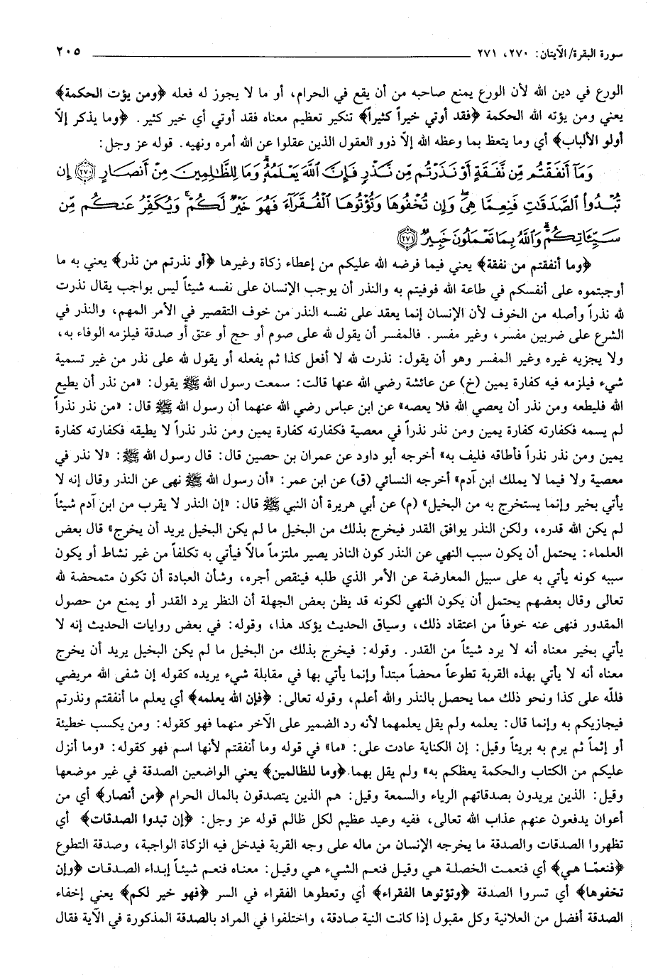 وَما أَنْفَقْتُمْ مِنْ نَفَقَةٍ أَوْ نَذَرْتُمْ مِنْ نَذْرٍ فَإِنَّ اللَّهَ يَعْلَمُهُ وَما لِلظَّالِمِينَ مِنْ أَنْصارٍ (270) إِنْ تُبْدُوا الصَّدَقاتِ فَنِعِمَّا هِيَ وَإِنْ تُخْفُوها وَتُؤْتُوهَا الْفُقَراءَ فَهُوَ خَيْرٌ لَكُمْ وَيُكَفِّرُ عَنْكُمْ مِنْ سَيِّئاتِكُمْ وَاللَّهُ بِما تَعْمَلُونَ خَبِيرٌ (271)