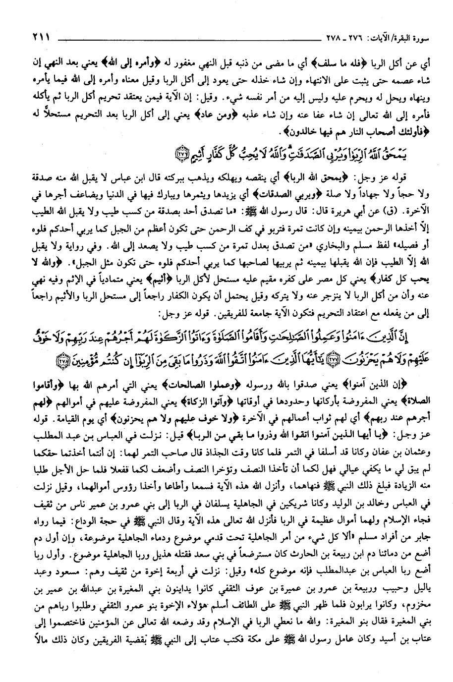 إِنَّ الَّذِينَ آمَنُوا وَعَمِلُوا الصَّالِحاتِ وَأَقامُوا الصَّلاةَ وَآتَوُا الزَّكاةَ لَهُمْ أَجْرُهُمْ عِنْدَ رَبِّهِمْ وَلا خَوْفٌ عَلَيْهِمْ وَلا هُمْ يَحْزَنُونَ (277) يا أَيُّهَا الَّذِينَ آمَنُوا اتَّقُوا اللَّهَ وَذَرُوا ما بَقِيَ مِنَ الرِّبا إِنْ كُنْتُمْ مُؤْمِنِينَ (278)