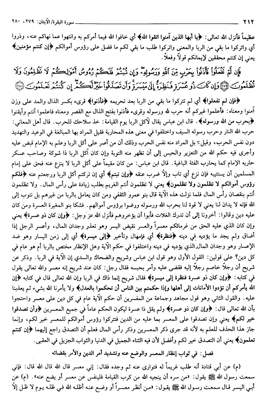 فَإِنْ لَمْ تَفْعَلُوا فَأْذَنُوا بِحَرْبٍ مِنَ اللَّهِ وَرَسُولِهِ وَإِنْ تُبْتُمْ فَلَكُمْ رُؤُسُ أَمْوالِكُمْ لا تَظْلِمُونَ وَلا تُظْلَمُونَ (279) وَإِنْ كانَ ذُو عُسْرَةٍ فَنَظِرَةٌ إِلى مَيْسَرَةٍ وَأَنْ تَصَدَّقُوا خَيْرٌ لَكُمْ إِنْ كُنْتُمْ تَعْلَمُونَ (280)