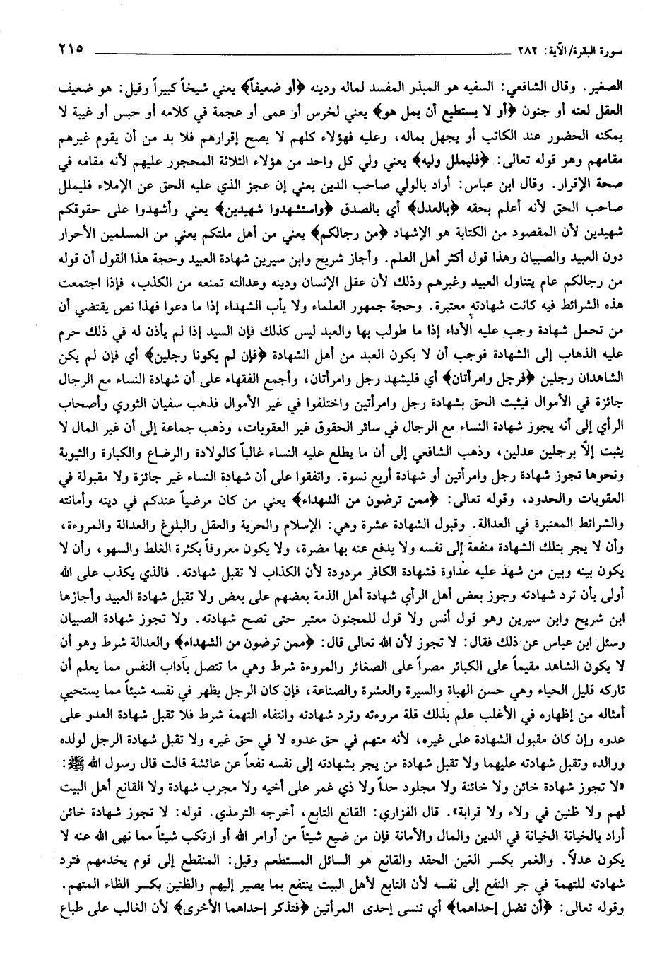 الصغير. وقال الشافعي: السفيه هو المبذر المفسد لماله ودينه أَوْ ضَعِيفاً يعني شيخا كبيرا وقيل: هو ضعيف العقل لعته أو جنون أَوْ لا يَسْتَطِيعُ أَنْ يُمِلَّ هُوَ يعني لخرس أو عمى أو عجمة في كلامه أو حبس أو غيبة لا يمكنه الحضور عند الكاتب أو يجهل بماله، وعليه فهؤلاء كلهم لا يصح إقرارهم فلا بد من أن يقوم غيرهم مقامهم وهو قوله تعالى: فَلْيُمْلِلْ وَلِيُّهُ يعني ولي كل واحد من هؤلاء الثلاثة المحجور عليهم لأنه مقامه في صحة الإقرار. وقال ابن عباس: أراد بالولي صاحب الدين يعني إن عجز الذي عليه الحق عن الإملاء فليملل صاحب الحق لأنه أعلم بحقه بِالْعَدْلِ أي بالصدق وَاسْتَشْهِدُوا شَهِيدَيْنِ يعني وأشهدوا على حقوقكم شهيدين لأن المقصود من الكتابة هو الإشهاد مِنْ رِجالِكُمْ يعني من أهل ملتكم يعني من المسلمين الأحرار دون العبيد والصبيان وهذا قول أكثر أهل العلم. وأجاز شريح وابن سيرين شهادة العبيد وحجة هذا القول أن قوله من رجالكم عام يتناول العبيد وغيرهم وذلك لأن عقل الإنسان ودينه وعدالته تمنعه من الكذب، فإذا اجتمعت هذه الشرائط فيه كانت شهادته معتبرة. وحجة جمهور العلماء ولا يأب الشهداء إذا ما دعوا فهذا نص يقتضي أن من تحمل شهادة وجب عليه الأداء إذا ما طولب بها والعبد ليس كذلك فإن السيد إذا لم يأذن له في ذلك حرم عليه الذهاب إلى الشهادة فوجب أن لا يكون العبد من أهل الشهادة فَإِنْ لَمْ يَكُونا رَجُلَيْنِ أي فإن لم يكن الشاهدان رجلين فَرَجُلٌ وَامْرَأَتانِ أي فليشهد رجل وامرأتان، وأجمع الفقهاء على أن شهادة النساء مع الرجال جائزة في الأموال فيثبت الحق بشهادة رجل وامرأتين واختلفوا في غير الأموال فذهب سفيان الثوري وأصحاب الرأي إلى أنه يجوز شهادة النساء مع الرجال في سائر الحقوق غير العقوبات، وذهب جماعة إلى أن غير المال لا يثبت إلّا برجلين عدلين، وذهب الشافعي إلى أن ما يطلع عليه النساء غالبا كالولادة والرضاع والكبارة والثيوبة ونحوها تجوز شهادة رجل وامرأتين أو شهادة أربع نسوة. واتفقوا على أن شهادة النساء غير جائزة ولا مقبولة في العقوبات والحدود، وقوله تعالى: مِمَّنْ تَرْضَوْنَ مِنَ الشُّهَداءِ يعني من كان مرضيا عندكم في دينه وأمانته والشرائط المعتبرة في العدالة. وقبول الشهادة عشرة وهي: الإسلام والحرية والعقل والبلوغ والعدالة والمروءة، وأن لا يجر بتلك الشهادة منفعة إلى نفسه ولا يدفع عنه بها مضرة، ولا يكون معروفا بكثرة الغلط والسهو، وأن لا يكون بينه وبين من شهد عليه عداوة فشهادة الكافر مردودة لأن الكذاب لا تقبل شهادته. فالذي يكذب على الله أولى بأن ترد شهادته وجوز بعض أهل الرأي شهادة أهل الذمة بعضهم على بعض ولا تقبل شهادة العبيد وأجازها ابن شريح وابن سيرين وهو قول أنس ولا قول للمجنون معتبر حتى تصح شهادته. ولا تجوز شهادة الصبيان وسئل ابن عباس عن ذلك فقال: لا تجوز لأن الله تعالى قال: مِمَّنْ تَرْضَوْنَ مِنَ الشُّهَداءِ والعدالة شرط وهو أن لا يكون الشاهد مقيما على الكبائر مصرا على الصغائر والمروءة شرط وهي ما تتصل بآداب النفس مما يعلم أن تاركه قليل الحياء وهي حسن الهباة والسيرة والعشرة والصناعة، فإن كان الرجل يظهر في نفسه شيئا مما يستحيي أمثاله من إظهاره في الأغلب علم بذلك قلة مروءته وترد شهادته وانتفاء التهمة شرط فلا تقبل شهادة العدو على عدوه وإن كان مقبول الشهادة على غيره، لأنه متهم في حق عدوه لا في حق غيره ولا تقبل شهادة الرجل لولده ووالده وتقبل شهادته عليهما ولا تقبل شهادة من يجر بشهادته إلى نفسه نفعا عن عائشة قالت قال رسول الله صلّى الله عليه وسلّم: