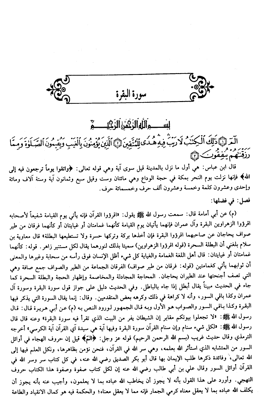 (فصل: في فضلها) (م) عن أبي أمامة قال: سمعت رسول الله صلّى الله عليه وسلّم يقول: «اقرءوا القرآن فإنه يأتي يوم القيامة شفيعا لأصحابه اقرءوا الزهراوين البقرة وآل عمران فإنهما يأتيان يوم القيامة كأنهما غمامتان أو غيايتان أو كأنهما فرقان من طير صواف يحاجان عن صاحبهما اقرءوا البقرة فإن أخذها بركة وتركها حسرة ولا تستطيعها البطلة» قال معاوية بن سلام بلغني أن البطلة السحرة (قوله اقرءوا الزهراوين) سميتا بذلك لنورهما يقال لكل مستنير زاهر. قوله: كأنهما غمامتان أو غيايتان: قال أهل اللغة الغمامة والغياية كل شيء أظل الإنسان فوق رأسه من سحابة وغيرها والمعنى أن ثوابهما يأتي كغمامتين (قوله: فرقان من طير صواف) الفرقان الجماعة من الطير والصواف جمع صافة وهي التي تصف أجنحتها عند الطيران يحاجان. المحاجة المجادلة والمخاصمة وإظهار الحجة والبطلة السحرة كما جاء في الحديث مبينا يقال أبطل إذا جاء بالباطل. وفي الحديث دليل على جواز قول سورة البقرة وسورة آل عمران وكذا باقي السور، وأنه لا كراهة في ذلك وكرهه بعض المتقدمين. وقال: إنما يقال السورة التي يذكر فيها البقرة وكذا باقي السور والصواب هو الأول وبه قال الجمهور لورود النص به (م) عن أبي هريرة قال: قال رسول الله صلّى الله عليه وسلّم: «لا تجعلوا بيوتكم مقابر إن الشيطان يفر من البيت الذي تقرأ فيه سورة البقرة» وعنه قال قال رسول الله صلّى الله عليه وسلّم: «لكل شيء سنام وإن سنام القرآن سورة البقرة وفيها آية هي سيدة آي القرآن آية الكرسي» أخرجه الترمذي وقال حديث غريب (بسم الله الرّحمن الرّحيم) قوله عز وجل: الم قيل إن حروف الهجاء في أوائل السور من المتشابه الذي استأثر الله بعلمه، وهي سر الله في القرآن، فنحن نؤمن بظاهرها، ونكل العلم فيها إلى الله تعالى، وفائدة ذكرها طلب الإيمان بها قال أبو بكر الصديق رضي الله عنه، في كل كتاب سر وسر الله في القرآن أوائل السور وقال علي بن أبي طالب رضي الله عنه إن لكل كتاب صفوة وصفوة هذا الكتاب حروف التهجي. وأورد على هذا القول بأنه لا يجوز أن يخاطب الله عباده بما لا يعلمون، وأجيب عنه بأنه يجوز أن يكلف الله عباده بما لا يعقل معناه كرمي الجمار فإنه مما لا يعقل معناه والحكمة فيه هو كمال الانقياد والطاعة