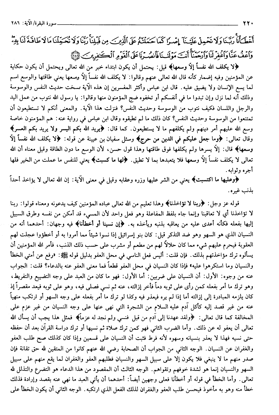 لا يُكَلِّفُ اللَّهُ نَفْساً إِلاَّ وُسْعَها لَها ما كَسَبَتْ وَعَلَيْها مَا اكْتَسَبَتْ رَبَّنا لا تُؤاخِذْنا إِنْ نَسِينا أَوْ أَخْطَأْنا رَبَّنا وَلا تَحْمِلْ عَلَيْنا إِصْراً كَما حَمَلْتَهُ عَلَى الَّذِينَ مِنْ قَبْلِنا رَبَّنا وَلا تُحَمِّلْنا ما لا طاقَةَ لَنا بِهِ وَاعْفُ عَنَّا وَاغْفِرْ لَنا وَارْحَمْنا أَنْتَ مَوْلانا فَانْصُرْنا عَلَى الْقَوْمِ الْكافِرِينَ (286)