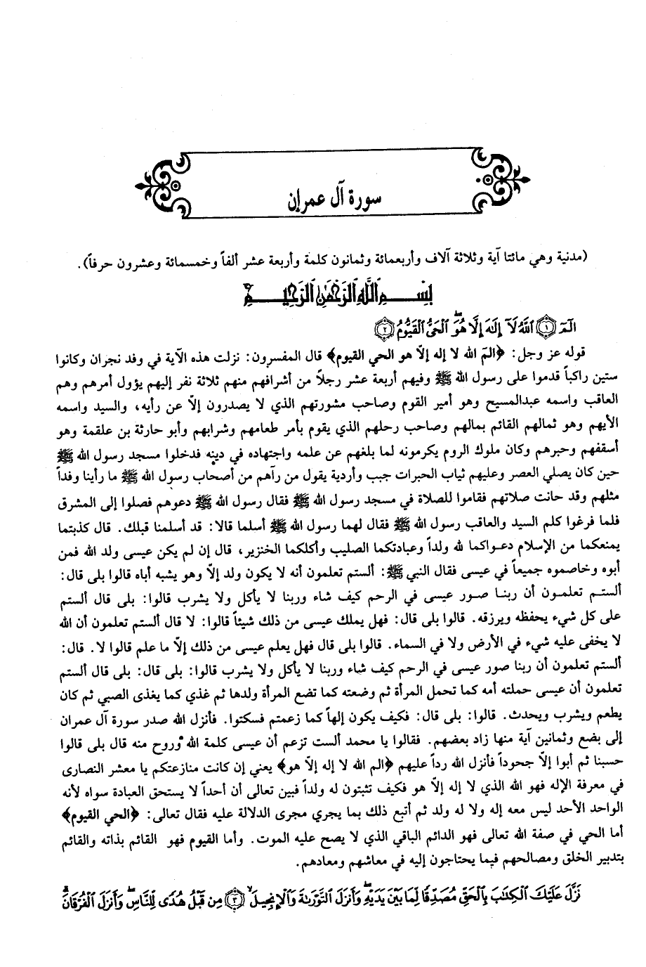 قوله عز وجل: الم اللَّهُ لا إِلهَ إِلَّا هُوَ الْحَيُّ الْقَيُّومُ قال المفسرون: نزلت هذه الآية في وفد نجران وكانوا ستين راكبا قدموا على رسول الله صلّى الله عليه وسلّم وفيهم أربعة عشر رجلا من أشرافهم منهم ثلاثة نفر إليهم يؤول أمرهم وهم العاقب واسمه عبد المسيح وهو أمير القوم وصاحب مشورتهم الذي لا يصدرون إلّا عن رأيه، والسيد واسمه الأيهم وهو ثمالهم القائم بمالهم وصاحب رحلهم الذي يقوم بأمر طعامهم وشرابهم وأبو حارثة بن علقمة وهو أسقفهم وحبرهم وكان ملوك الروم يكرمونه لما بلغهم عن علمه واجتهاده في دينه فدخلوا مسجد رسول الله صلّى الله عليه وسلّم حين كان يصلي العصر وعليهم ثياب الحبرات جبب وأردية يقول من رآهم من أصحاب رسول الله صلّى الله عليه وسلّم ما رأينا وفدا مثلهم وقد حانت صلاتهم فقاموا للصلاة في مسجد رسول الله صلّى الله عليه وسلّم فقال رسول الله صلّى الله عليه وسلّم دعوهم فصلوا إلى المشرق فلما فرغوا كلم السيد والعاقب رسول الله صلّى الله عليه وسلّم فقال لهما رسول الله صلّى الله عليه وسلّم أسلما قالا: قد أسلمنا قبلك. قال كذبتما يمنعكما من الإسلام دعواكما لله ولدا وعبادتكما الصليب وأكلكما الخنزير، قال إن لم يكن عيسى ولد الله فمن أبوه وخاصموه جميعا في عيسى فقال النبي صلّى الله عليه وسلّم: ألستم تعلمون أنه لا يكون ولد إلّا وهو يشبه أباه قالوا بلى قال: