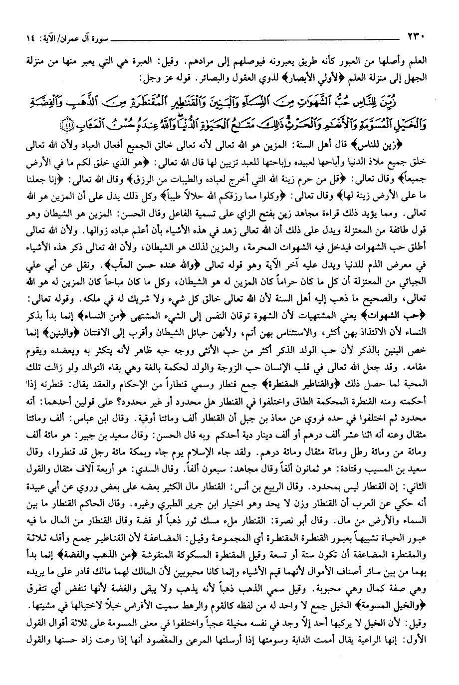 حُبُّ الشَّهَواتِ يعني المشتهيات لأن الشهوة توقان النفس إلى الشيء المشتهى مِنَ النِّساءِ إنما بدأ بذكر النساء لأن الالتذاذ بهن أكثر، والاستئناس بهن أتم، ولأنهن حبائل الشيطان وأقرب إلى الافتتان وَالْبَنِينَ إنما خص البنين بالذكر لأن حب الولد الذكر أكثر من حب الأنثى ووجه حبه ظاهر لأنه يتكثر به ويعضده ويقوم مقامه. وقد جعل الله تعالى في قلب الإنسان حب الزوجة والولد لحكمة بالغة وهي بقاء التوالد ولو زالت تلك المحبة لما حصل ذلك وَالْقَناطِيرِ الْمُقَنْطَرَةِ جمع قنطار وسمي قنطارا من الإحكام والعقد يقال: قنطرته إذا أحكمته ومنه القنطرة المحكمة الطاق واختلفوا في القنطار هل محدود أو غير محدود؟ على قولين أحدهما: أنه محدود ثم اختلفوا في حده فروي عن معاذ بن جبل أن القنطار ألف ومائتا أوقية. وقال ابن عباس: ألف ومائتا مثقال وعنه أنه اثنا عشر ألف درهم أو ألف دينار دية أحدكم وبه قال الحسن: وقال سعيد بن جبير: هو مائة ألف ومائة من ومائة رطل ومائة مثقال ومائة درهم. ولقد جاء الإسلام يوم جاء وبمكة مائة رجل قد قنطروا، وقال سعيد بن المسيب وقتادة: هو ثمانون ألفا وقال مجاهد: سبعون ألفا. وقال السدي: هو أربعة آلاف مثقال والقول الثاني: إن القنطار ليس بمحدود. وقال الربيع بن أنس: القنطار مال الكثير بعضه على بعض وروي عن أبي عبيدة أنه حكي عن العرب أن القنطار وزن لا يحد وهو اختيار ابن جرير الطبري وغيره. وقال الحاكم القنطار ما بين السماء والأرض من مال. وقال أبو نصرة: القنطار ملء مسك ثور ذهبا أو فضة وقال القنطار من المال ما فيه عبور الحياة تشبيها بعبور القنطرة المقنطرة أي المجموعة وقيل: المضاعفة لأن القناطير جمع وأقله ثلاثة والمقنطرة المضاعفة أن تكون ستة أو تسعة وقيل المقنطرة المسكوكة المنقوشة مِنَ الذَّهَبِ وَالْفِضَّةِ إنما بدأ بهما من بين سائر أصناف الأموال لأنهما قيم الأشياء وإنما كانا محبوبين لأن المالك لهما مالك قادر على ما يريده وهي صفة كمال وهي محبوبة. وقيل سمي الذهب ذهبا لأنه يذهب ولا يبقى والفضة لأنها تنفض أي تتفرق وَالْخَيْلِ الْمُسَوَّمَةِ الخيل جمع لا واحد له من لفظه كالقوم والرهط سميت الأفراس خيلا لاختيالها في مشيتها.