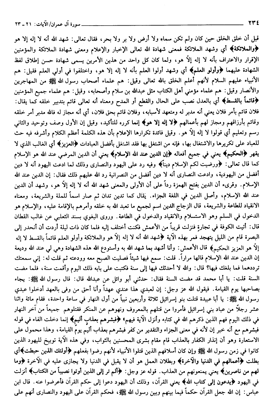فلان قائم بأمر فلان يعني أنه مدبر له ومتعهد لأسبابه، وفلان قائم بحق فلان، أي أنه مجاز له فالله مدبر أمر خلقه وقائم بأرزاقهم ومجاز لهم بأعمالهم لا إِلهَ إِلَّا هُوَ إنما كرره للتأكيد، وقيل إن الأول وصف وتوحيد والثاني رسم وتعليم أي قولوا لا إله إلّا هو. وقيل فائدة تكرارها الإعلام بأن هذه الكلمة أعظم الكلام وأشرفه فيه حث للعباد على تكريرها والاشتغال بها، فإنه من اشتغل بها فقد اشتغل بأفضل العبادات الْعَزِيزُ أي الغالب الذي لا يقهر الْحَكِيمُ يعني في جميع أفعاله إِنَّ الدِّينَ عِنْدَ اللَّهِ الْإِسْلامُ يعني أن الدين المرضي عند الله هو الإسلام كما قال تعالى: وَرَضِيتُ لَكُمُ الْإِسْلامَ دِيناً وفيه رد على اليهود والنصارى وذلك لما ادعت اليهود أنه لا دين أفضل من اليهودية، وادعت النصارى أنه لا دين أفضل من النصرانية رد الله عليهم ذلك فقال: إن الدين عند الله الإسلام. وقرئ أن الدين بفتح الهمزة ردا على أن الأولى والمعنى شهد الله أنه لا إله إلّا هو، وشهد أن الدين عند الله الإسلام، وأصل الدين في اللغة الجزاء. يقال كما تدين تدان ثم صار اسما للملة والشريعة، ومعناه الانقياد للطاعة والشريعة، قال الزجاج الدين اسم لجميع ما تعبد الله به خلقه وأمرهم بالإقامة عليه، والإسلام هو الدخول في السلم وهو الاستسلام والانقياد والدخول في الطاعة. وروى البغوي بسند الثعلبي عن غالب القطان قال: أتيت الكوفة في تجارة فنزلت قريبا من الأعمش فكنت أختلف إليه فلما كان ذات ليلة أردت أن أنحدر إلى البصرة قام من الليل يتهجد فمر بهذه الآية شَهِدَ اللَّهُ أَنَّهُ لا إِلهَ إِلَّا هُوَ وَالْمَلائِكَةُ وَأُولُوا الْعِلْمِ قائِماً بِالْقِسْطِ لا إِلهَ إِلَّا هُوَ الْعَزِيزُ الْحَكِيمُ قال الأعمش: وأنا أشهد بما شهد الله به وأستودع الله هذه الشهادة وهي لي عند الله وديعة إن الدين عند الله الإسلام قالها مرارا. قلت: سمع فيها شيئا فصليت الصبح معه وودعته ثم قلت له: إني سمعتك ترددهما فما بلغك فيها؟ قال: والله لا أحدثك فيها إلى سنة فكتبت على بابه ذلك اليوم وأقمت سنة، فلما مضت السنة قلت: يا أبا محمد قد مضت السنة فقال: حدثني أبو وائل عن عبد الله قال: قال رسول الله صلّى الله عليه وسلّم: يجاء بصاحبها يوم القيامة. فيقول الله عز وجل: إن لعبدي هذا عندي عهدا وأنا أحق من وفي بالعهد أدخلوا عبدي رسول الله صلّى الله عليه وسلّم: يا أبا عبيدة قتلت بنو إسرائيل ثلاثة وأربعين نبيا من أول النهار في ساعة واحدة، فقام مائة واثنا عشر رجلا من عباد بني إسرائيل فأمروا من قتلهم بالمعروف ونهوهم عن المنكر فقتلوهم جميعا من آخر النهار في ذلك اليوم فهم الذين ذكرهم الله في كتابه وأنزل الآية فيهم» فَبَشِّرْهُمْ بِعَذابٍ أَلِيمٍ إنما دخلت الفاء في قوله فبشرهم مع أنه خبر إن لأنه في معنى الجزاء والتقدير من كفر فبشرهم بعذاب أليم يوم القيامة، وهذا محمول على الاستعارة وهو أن إنذار الكفار بالعذاب قام مقام بشرى المحسنين بالثواب، وفي هذه الآية توبيخ لليهود الذين كانوا في زمن رسول الله صلّى الله عليه وسلّم وإن كان أسلافهم الذين قتلوا الأنبياء لأنهم رضوا بفعلهم أُولئِكَ الَّذِينَ حَبِطَتْ أي بطلت أَعْمالُهُمْ فِي الدُّنْيا وَالْآخِرَةِ وبطلان العمل هو أن لا يقبل في الدنيا ولا يجازى عليه في الآخرة وَما لَهُمْ مِنْ ناصِرِينَ يعني يمنعونهم من العذاب. قوله عز وجل: أَلَمْ تَرَ إِلَى الَّذِينَ أُوتُوا نَصِيباً مِنَ الْكِتابِ أنزلت في اليهود يُدْعَوْنَ إِلى كِتابِ اللَّهِ يعني القرآن، وذلك أن اليهود دعوا إلى حكم القرآن فأعرضوا عنه. قال ابن عباس: إن الله جعل القرآن حكما فيما بينهم وبين رسول الله صلّى الله عليه وسلّم، فحكم القرآن على اليهود والنصارى أنهم على