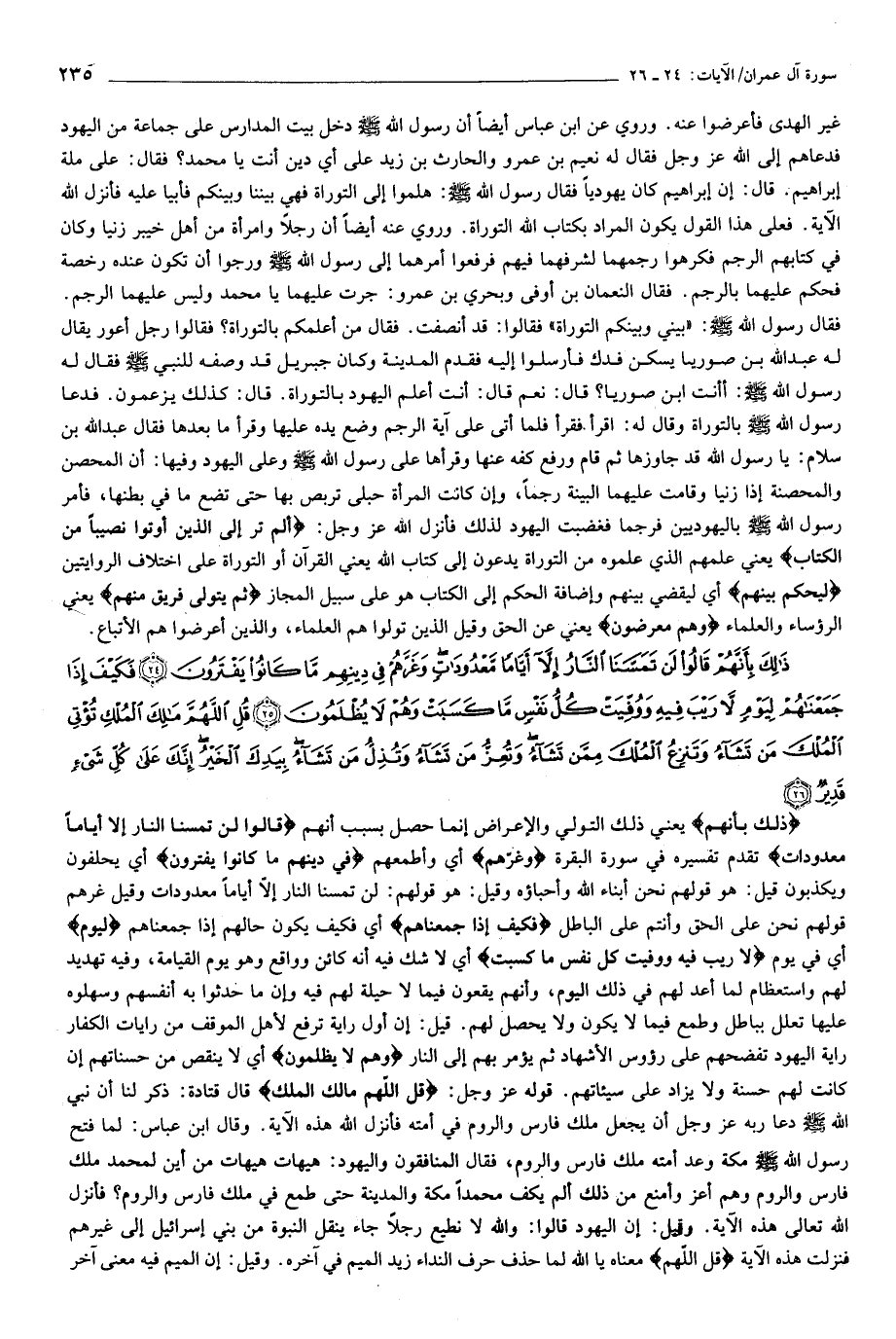 ذلِكَ بِأَنَّهُمْ قالُوا لَنْ تَمَسَّنَا النَّارُ إِلاَّ أَيَّاماً مَعْدُوداتٍ وَغَرَّهُمْ فِي دِينِهِمْ ما كانُوا يَفْتَرُونَ (24) فَكَيْفَ إِذا جَمَعْناهُمْ لِيَوْمٍ لا رَيْبَ فِيهِ وَوُفِّيَتْ كُلُّ نَفْسٍ ما كَسَبَتْ وَهُمْ لا يُظْلَمُونَ (25) قُلِ اللَّهُمَّ مالِكَ الْمُلْكِ تُؤْتِي الْمُلْكَ مَنْ تَشاءُ وَتَنْزِعُ الْمُلْكَ مِمَّنْ تَشاءُ وَتُعِزُّ مَنْ تَشاءُ وَتُذِلُّ مَنْ تَشاءُ بِيَدِكَ الْخَيْرُ إِنَّكَ عَلى كُلِّ شَيْءٍ قَدِيرٌ (26)