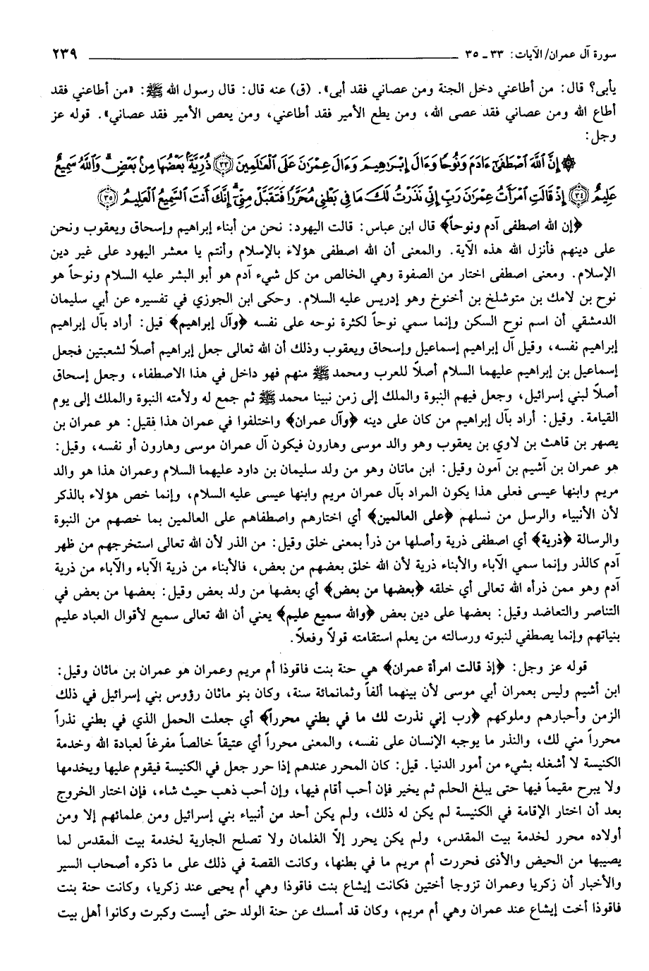 إِنَّ اللَّهَ اصْطَفى آدَمَ وَنُوحاً وَآلَ إِبْراهِيمَ وَآلَ عِمْرانَ عَلَى الْعالَمِينَ (33) ذُرِّيَّةً بَعْضُها مِنْ بَعْضٍ وَاللَّهُ سَمِيعٌ عَلِيمٌ (34) إِذْ قالَتِ امْرَأَتُ عِمْرانَ رَبِّ إِنِّي نَذَرْتُ لَكَ ما فِي بَطْنِي مُحَرَّراً فَتَقَبَّلْ مِنِّي إِنَّكَ أَنْتَ السَّمِيعُ الْعَلِيمُ (35)