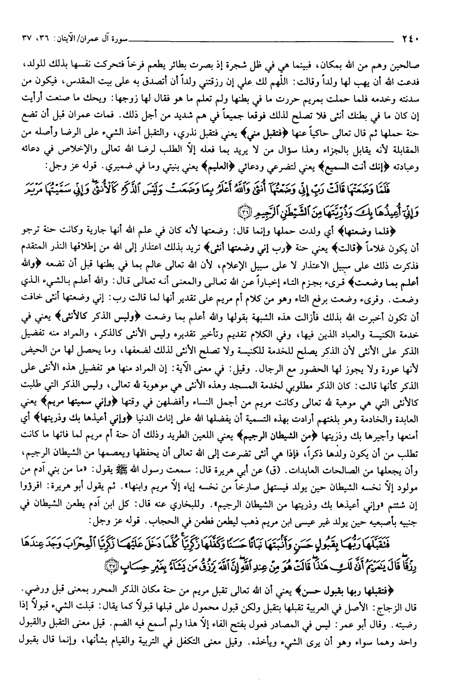 فَلَمَّا وَضَعَتْها قالَتْ رَبِّ إِنِّي وَضَعْتُها أُنْثى وَاللَّهُ أَعْلَمُ بِما وَضَعَتْ وَلَيْسَ الذَّكَرُ كَالْأُنْثى وَإِنِّي سَمَّيْتُها مَرْيَمَ وَإِنِّي أُعِيذُها بِكَ وَذُرِّيَّتَها مِنَ الشَّيْطانِ الرَّجِيمِ (36)